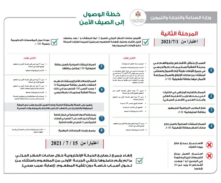 وتضمن الرسم التأكيد على استمرار منع فتح بيوت العزاء ومنع التجمعات لأكثر من 20 شخصا باستثناء الدعوات الاجتماعية في المنازل الخاصة والتي حددت لها الحكومة شروطا خاصة، إضافة إلى صالات الأفراح بحد أقصى 100 شخص.