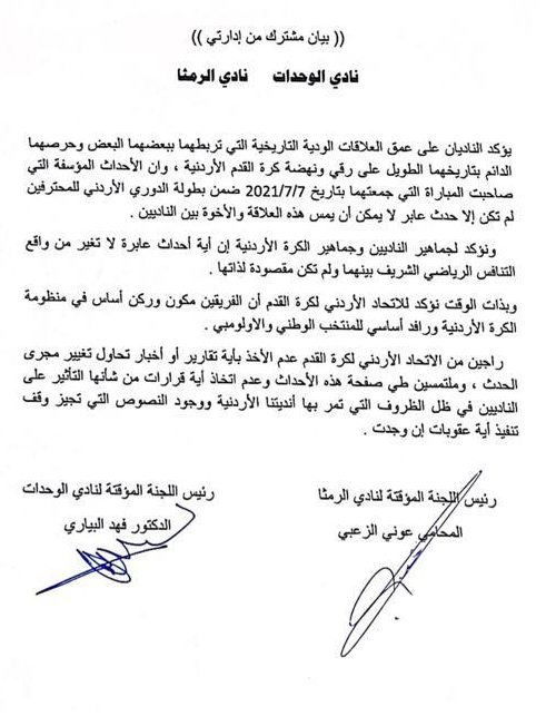 واضاف البيان، ان الاحداث المؤسفة التي صاحبت المباراة التي جمعت الفريقين بتاريخ 7-7-2021 ضمن بطولة الدوري الاردني للمحترفين لم تكن الا حدث عابر لا يمكن ان يمس هذه العلاقة والاخوة بين الناديين