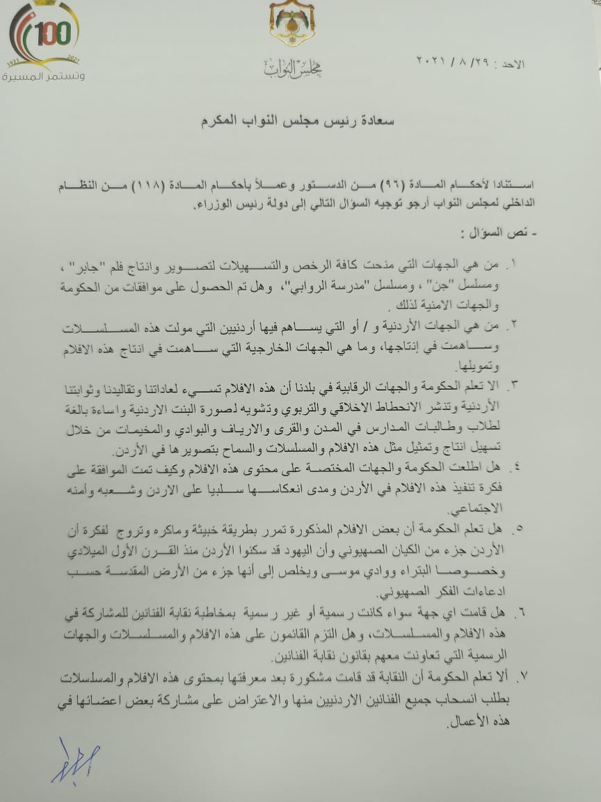 11.هل لدى الحكومة نية باتخاذ الاجراءات بحق من ينتجون هذه الافلام والمسلسلات التي تسيء للأردن وتاريخه من امثال "جابر " و"جن" و"مدرسة الروابي للبنات"، وهل قامت بإجراءات تحقيق ومساءلة تجاه مضمونها ومن أنتجوها ومن مثلوها ومن شاركوا بتنفيذها.