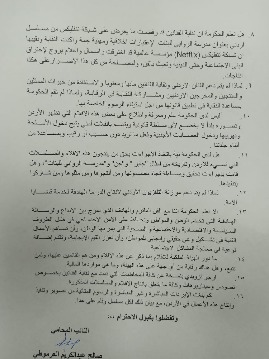 8.هل تعلم الحكومة ان نقابة الفنانين قد رفضت ما يعرض على شبكة نتفليكس من مسلسل اردني بعنوان مدرسة الروابي للبنات لإعتبارات اخلاقية ومهنية جمة واكدت النقابة ونقيبها ان شبكة نتفليكس (Netflix) مؤسسة عالمية قد اخترقت راسمال واعلام يروج لإختراق البنى الاجتماعية وحتى الدينية وتعبث بالفن، ولمصلحة من كل هذا الاصرارعلى هكذا انتاجات.