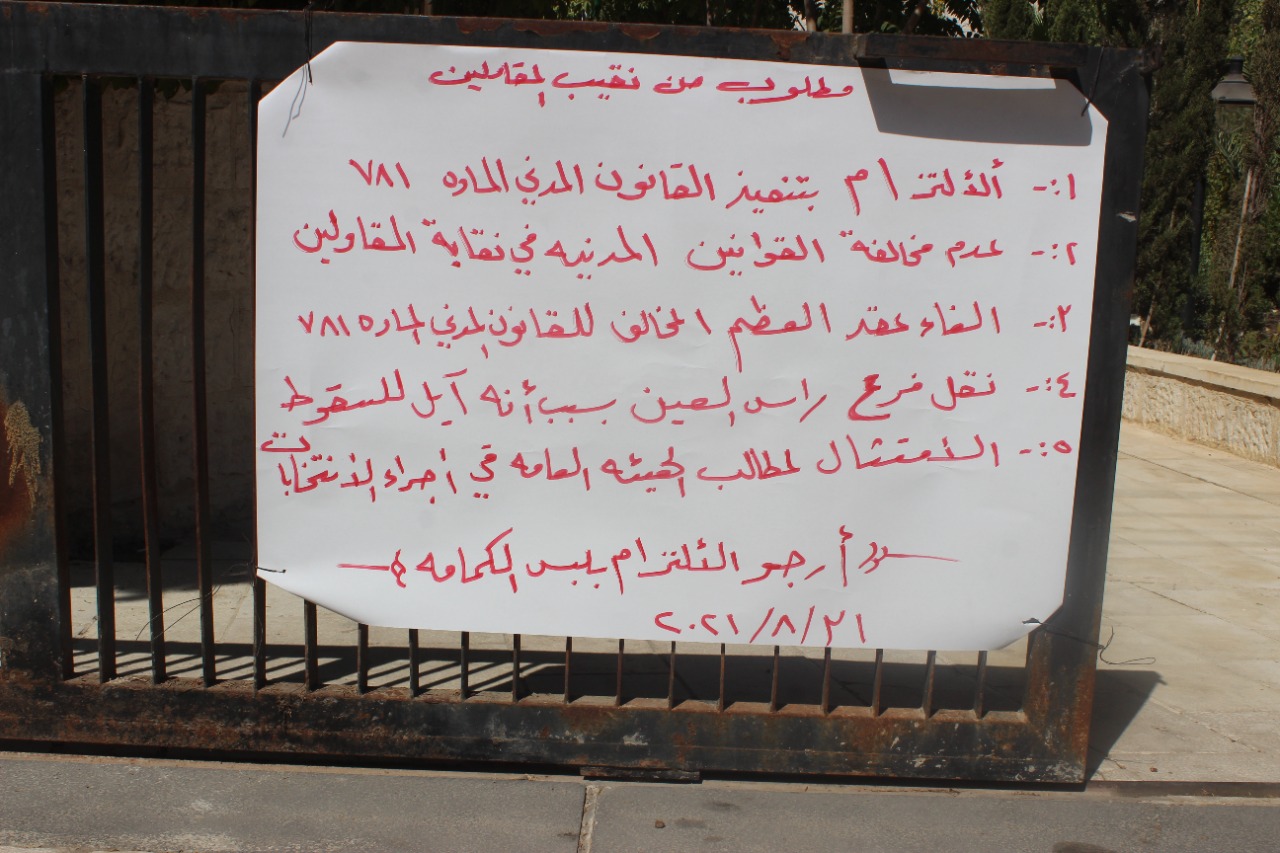 ويشار إلى أن المحتجين تبنو جملة من المطالب وهي الإلتزام بتنفيذ القانون المدني خصوصًا المادة (781) والغاء عقد العظم، وعدم مخالفة القوانين المدنية، والإمتثال لمطالب الهيئة العامة وإجراء انتخابات النقابة.
