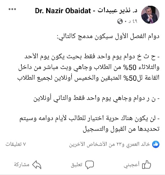وقال عبيدات في منشور له عبر فيسبوك إن دوام الفصل الأول سيكون مدمج على النحو التالي: