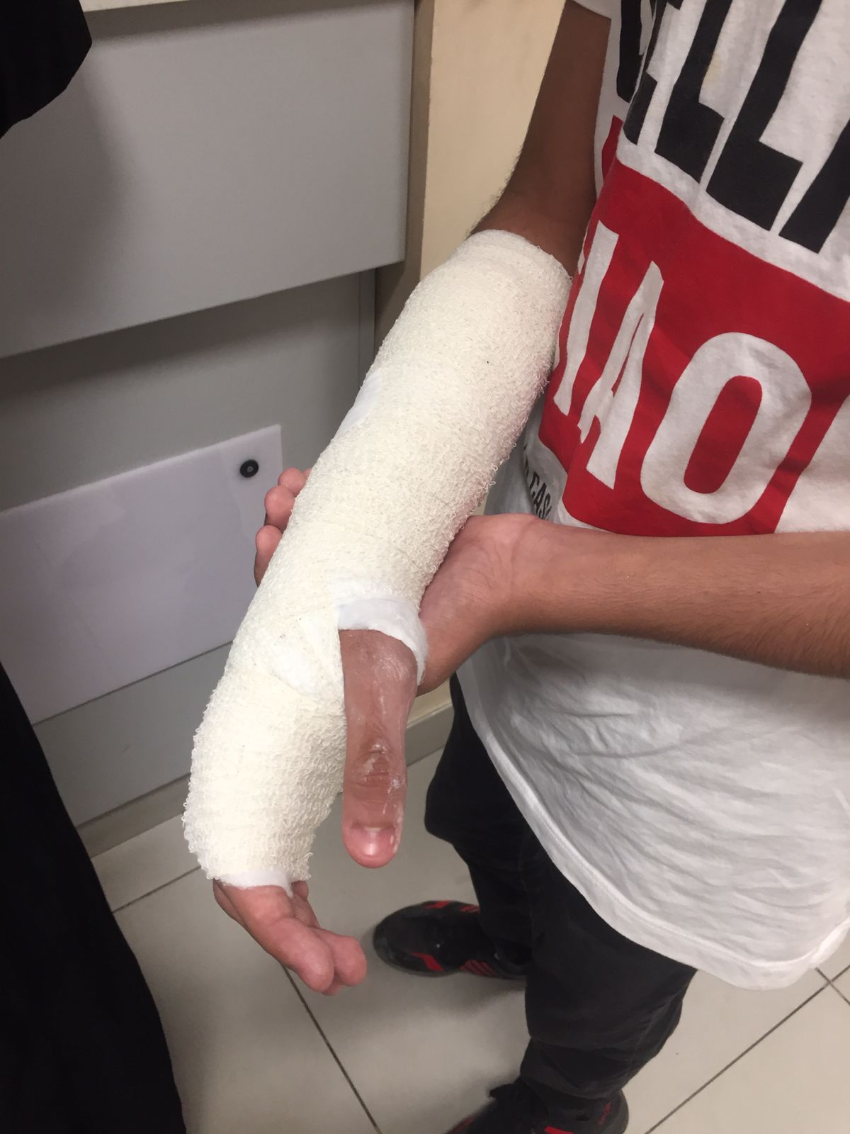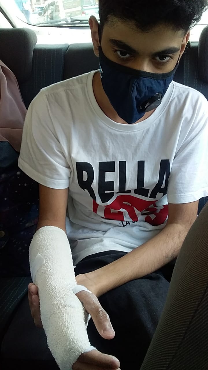 وقال فتحي الراميني ، انه تلقى اتصالاً من ادارة المدرسة يطلب منه الحضور لنقل ابنه الى المستشفى حيث توجه الى المدرسة وقام باخذ ابنه الى مستشفى البشير لتلقي المعالجة المناسبة والتي تمثلت بوضع الجبيرة على يده المكسورة.