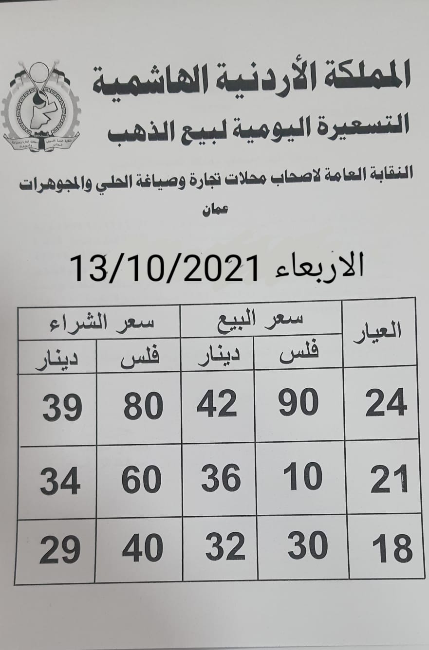 وبلغ سعر بيع الغرام من الذهب عياري 24 و18 لغايات الشراء من محلات الصاغة عند 42.9 و32،3 دينارا على التوالي.