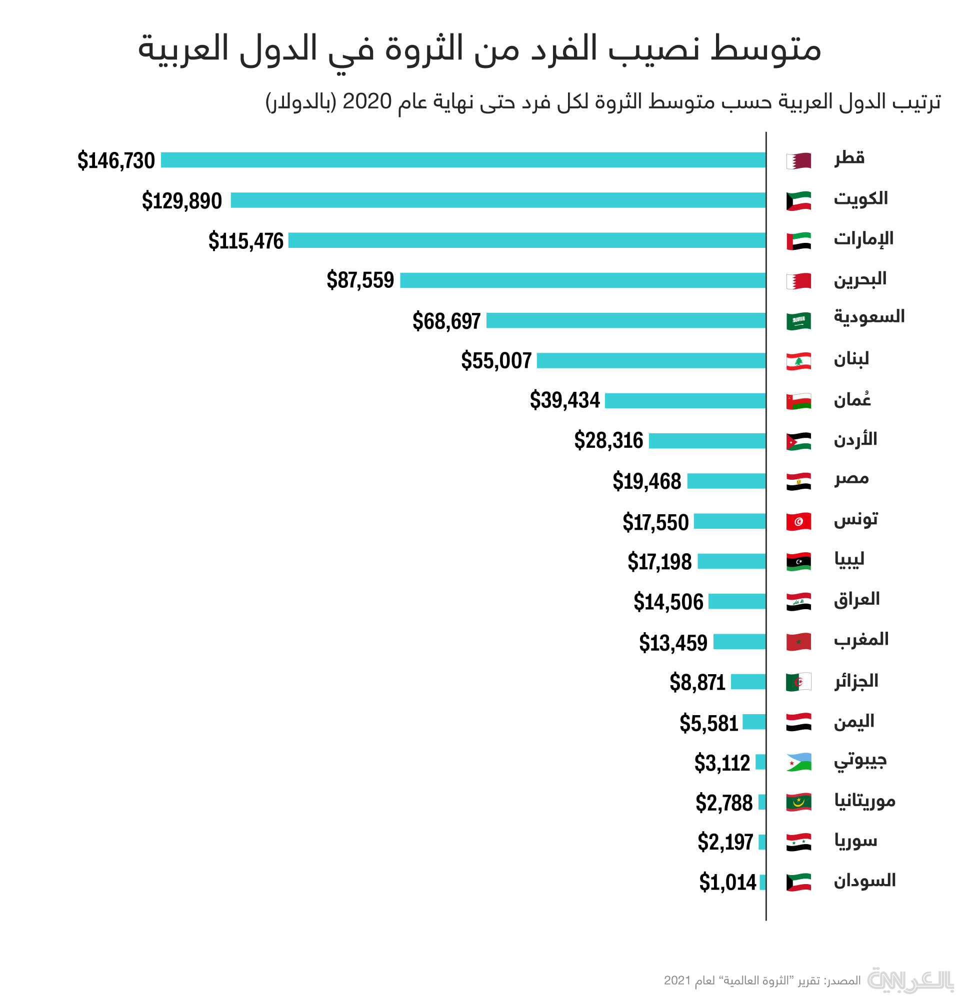 وشمل التقرير بيانات عن متوسط نصيب الفرد من الثروة في كل دولة، لتتصدر قطر المرتبة الأولى عربيًا بمتوسط ثروة لكل فرد بلغ 146.7 ألف دولار أمريكي، ثم جاءت بعدها الكويت بمتوسط بلغ 129.8 ألف دولار، وثالثًا الإمارات بمتوسط بلغ 115.4 ألف دولار.