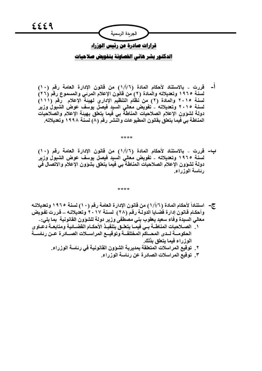 فيما فوض الوزير الشبول بصلاحيات رئيس الوزراء بقانون المطبوعات والنشر، وصلاحيات شؤون الاعلام والاتصال في رئاسة الوزراء.