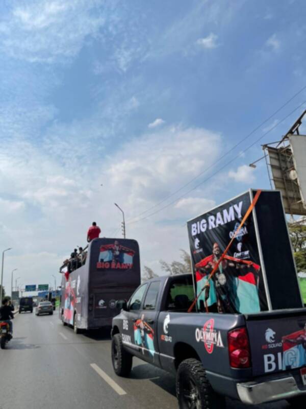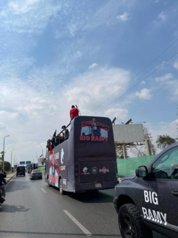 تحركت الحافلة المكشوفة، التي استقلها بطل كمال الأجسام العالمي بيج رامي، فور خروجه من مطار القاهرة، قادما من نيويورك.