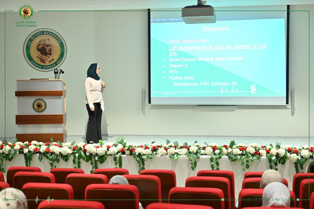 والقت فنية المختبر لينا الحياري محاضرة تطرقت فيها الى الفحوصات الاساسية المخبرية التي يمكن اجراؤها للمساعدة على معرفة عوامل الخطر التي تؤدي الى تطور مرض هشاشة العظام .