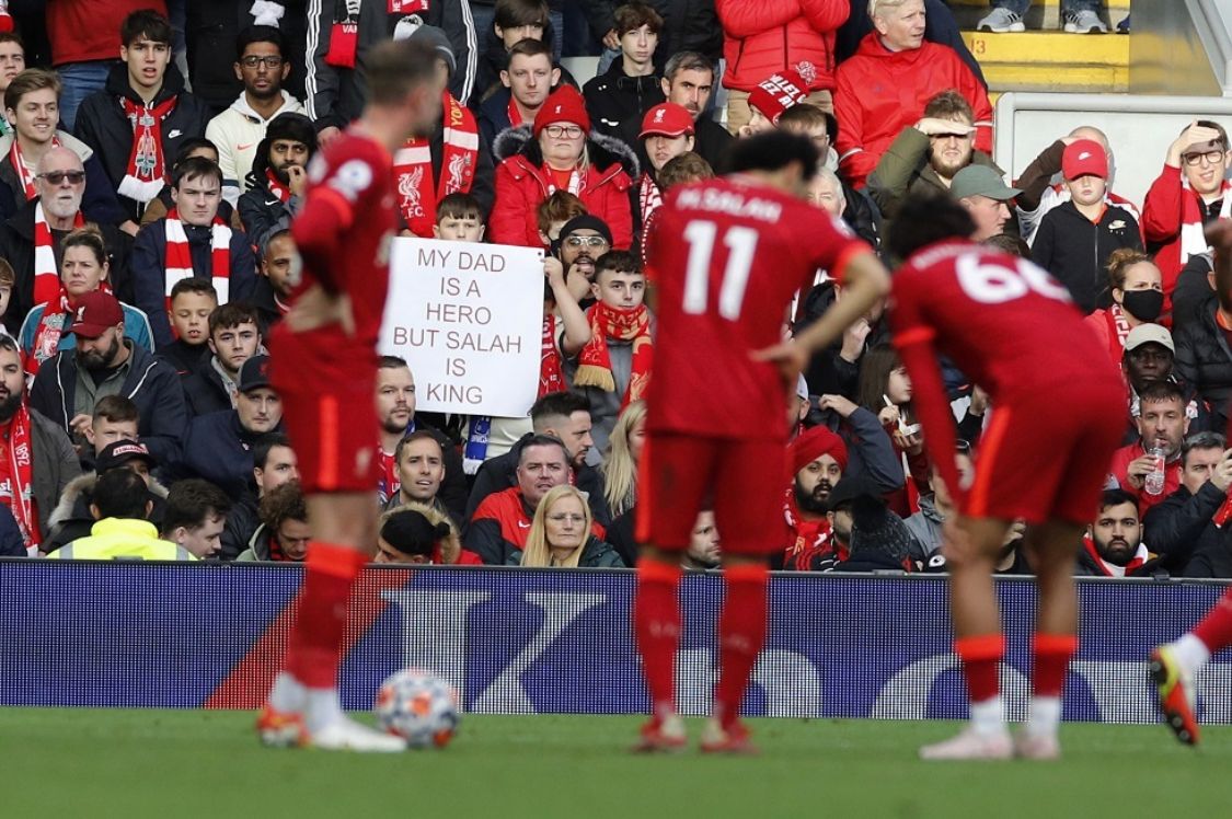 وجه مشجع صغير لفريق ليفربول الإنجليزي رسالة للنجم المصري محمد صلاح خلال مباراة فريقه أمام برايتون أمس.