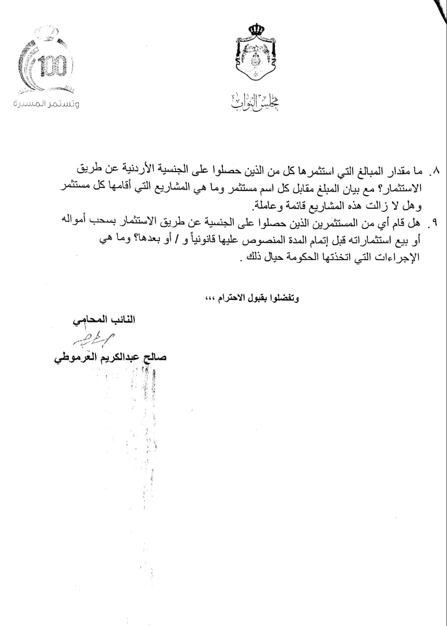 وسأل العرموطي، عن عدد الأشخاص الذين تم منحهم الجنسية الأردنية منذ بداية عام 2019 وحتى تاريخه، وبيان العدد لكل عام والقرارات الصادرة بهذا الشأن، وأسباب التجنيس ومقدار المبالغ التي استثمرها المجنسين والمشاريع التي أقامها كل مستثمر.