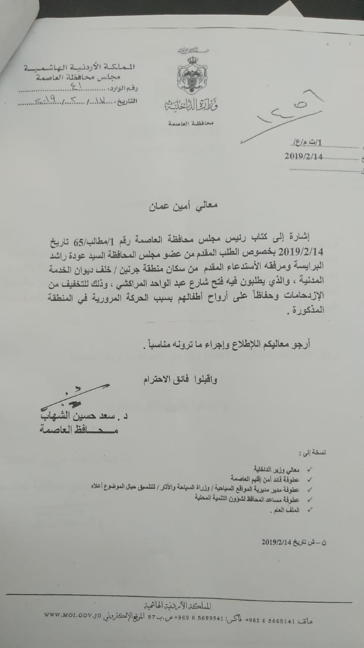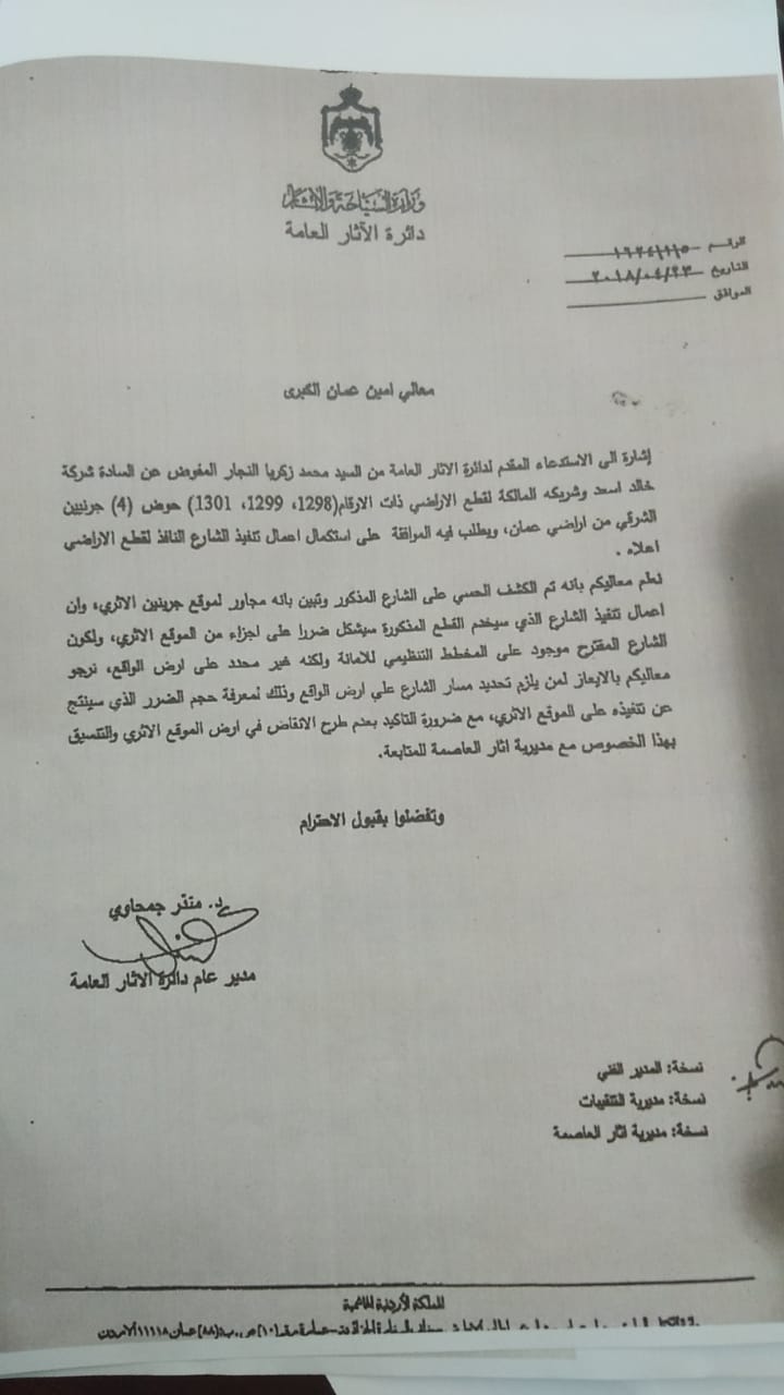 وزود الأهالي أخبار البلد بجيمع الوثائق التي نقلت للجهات الرسمية من أجل فتح الشارع، إلى جانب جميع الردود التي تلقوها لغاية اللحظة، من بينها خطاب محافظ العاصمة إلى أمانة عمان، وايضًا شكوى الأهالي لأمانة يبينون فيها حجم الضرر الواقع عليهم جراء استمرار اغلاق الشارع من قبل دائرة الآثار العامة.