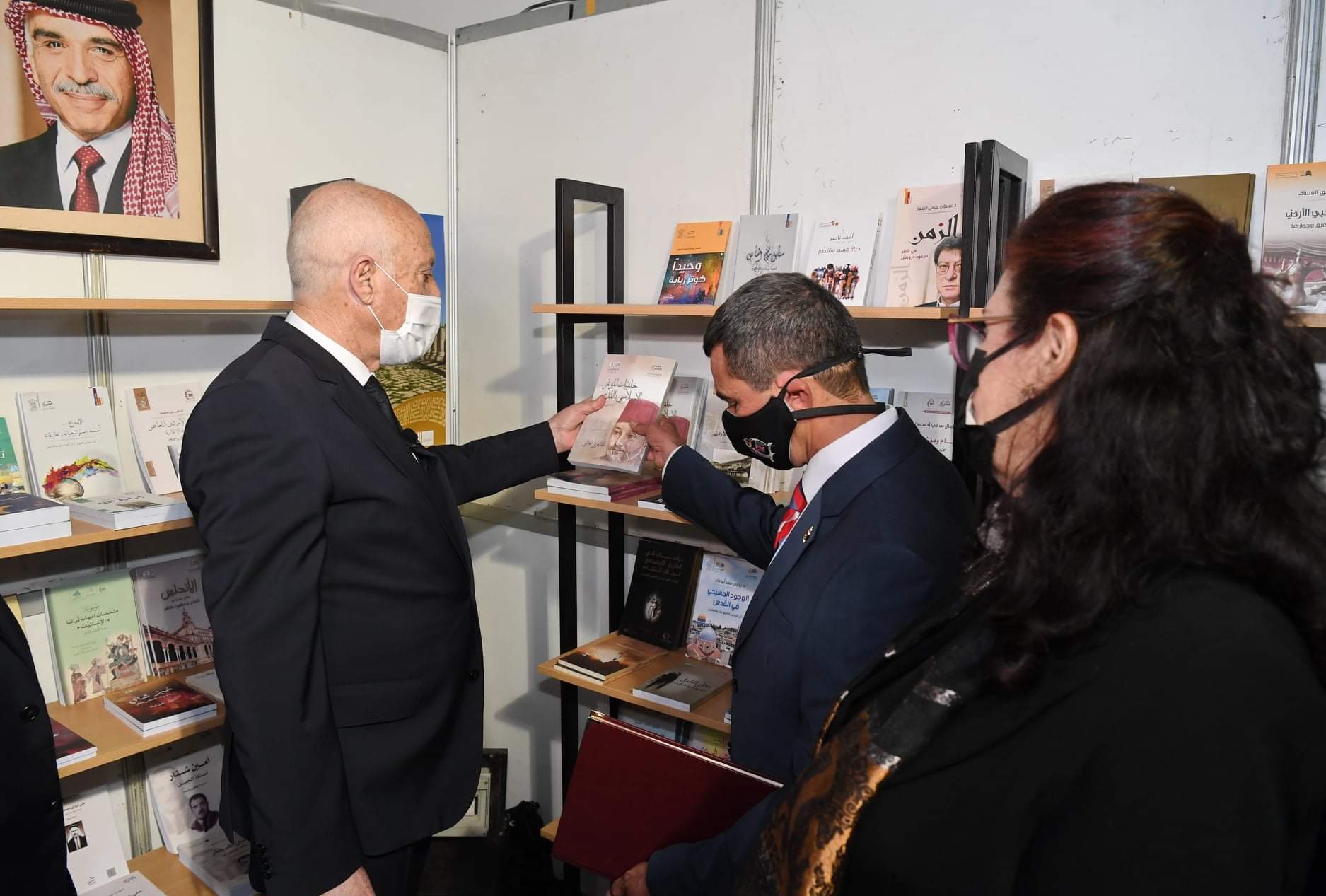 واختار الرئيس سعيد بعض العناوين التاريخية والسياسية التي اشتمل عليها جناح الكتاب لعدد من المفكرين والأكاديميين والكتاب الأردنيين، ومنها نصوص إعلان استقلال الأردن.