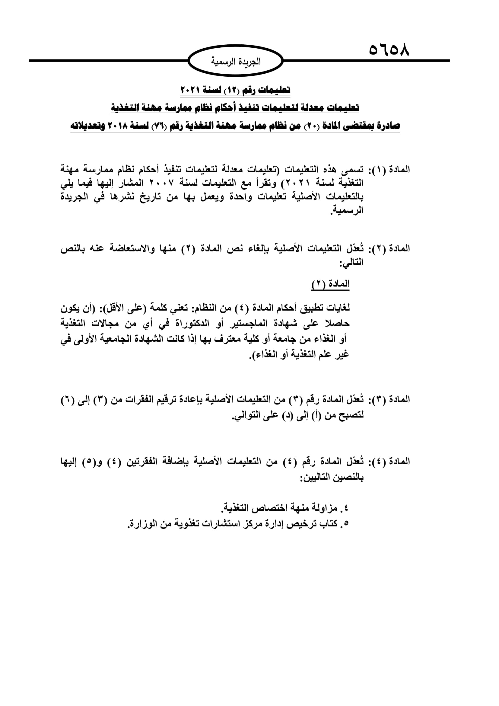 أخبار البلد - صدر في عدد الجريدة الرسمية تعليمات معدلة لتعليمات تنفيذ أحكام نظام ممارسة مهنة التغذية.