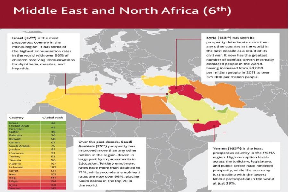 وعربياً، حلّت الإمارات في المرتبة الأولى تلتها قطر، ثم البحرين، ثم الكويت، وعُمان، ثم السعودية، وفي المرتبة السابعة الأردن، ثم المغرب وتونس والجزائر ولبنان، فيما سجلت مصر والعراق وليبيا وسوريا والسودان والصومال واليمن وجنوب السودان أدنى معدلات الازدهار في التصنيف.