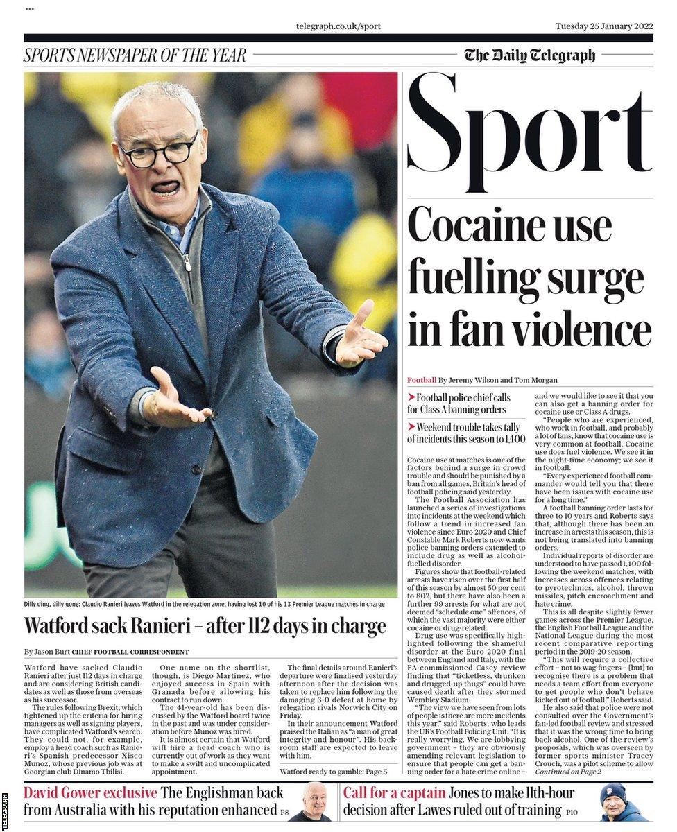 وكتبت أيضًا: "تعاطي الكوكايين يغذي العنف لدي المشجعين.. مسوؤلو شرطة كرة القدم يطالبون بعقوبات إيقاف من الدرجة الأولى.. أحداث نهاية الأسبوع تصل بالحوادث هذا الموسم إلى 1400 واقعة".