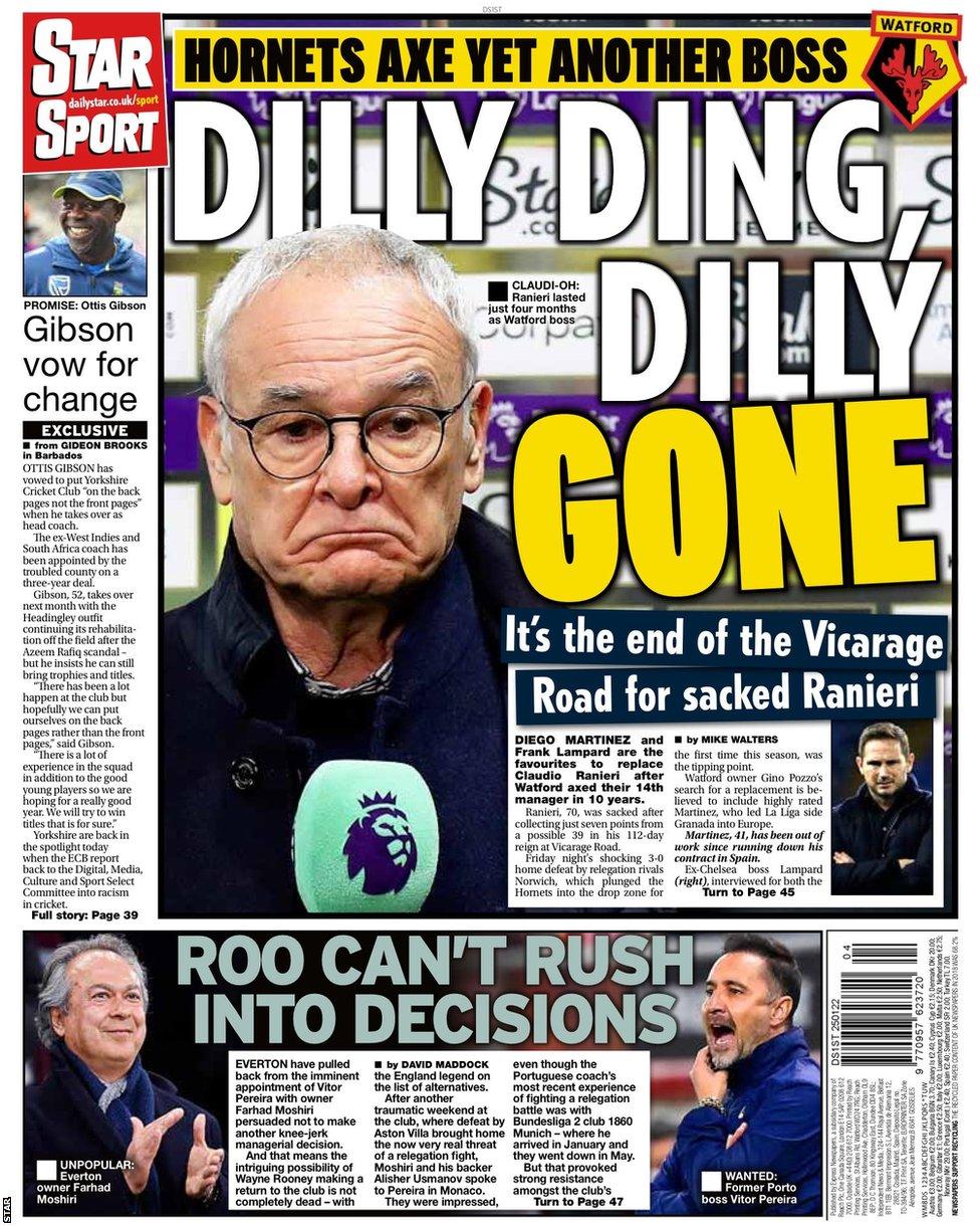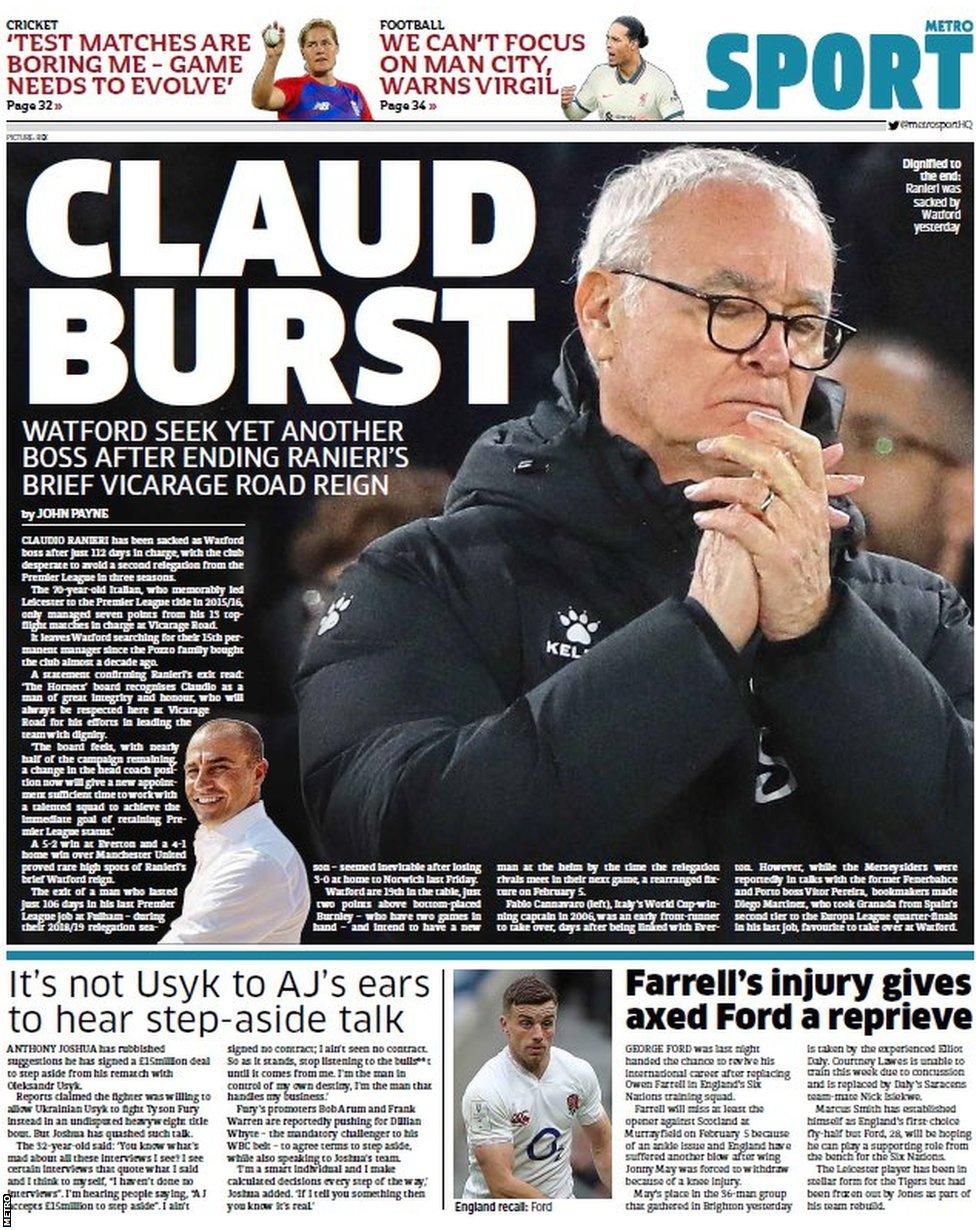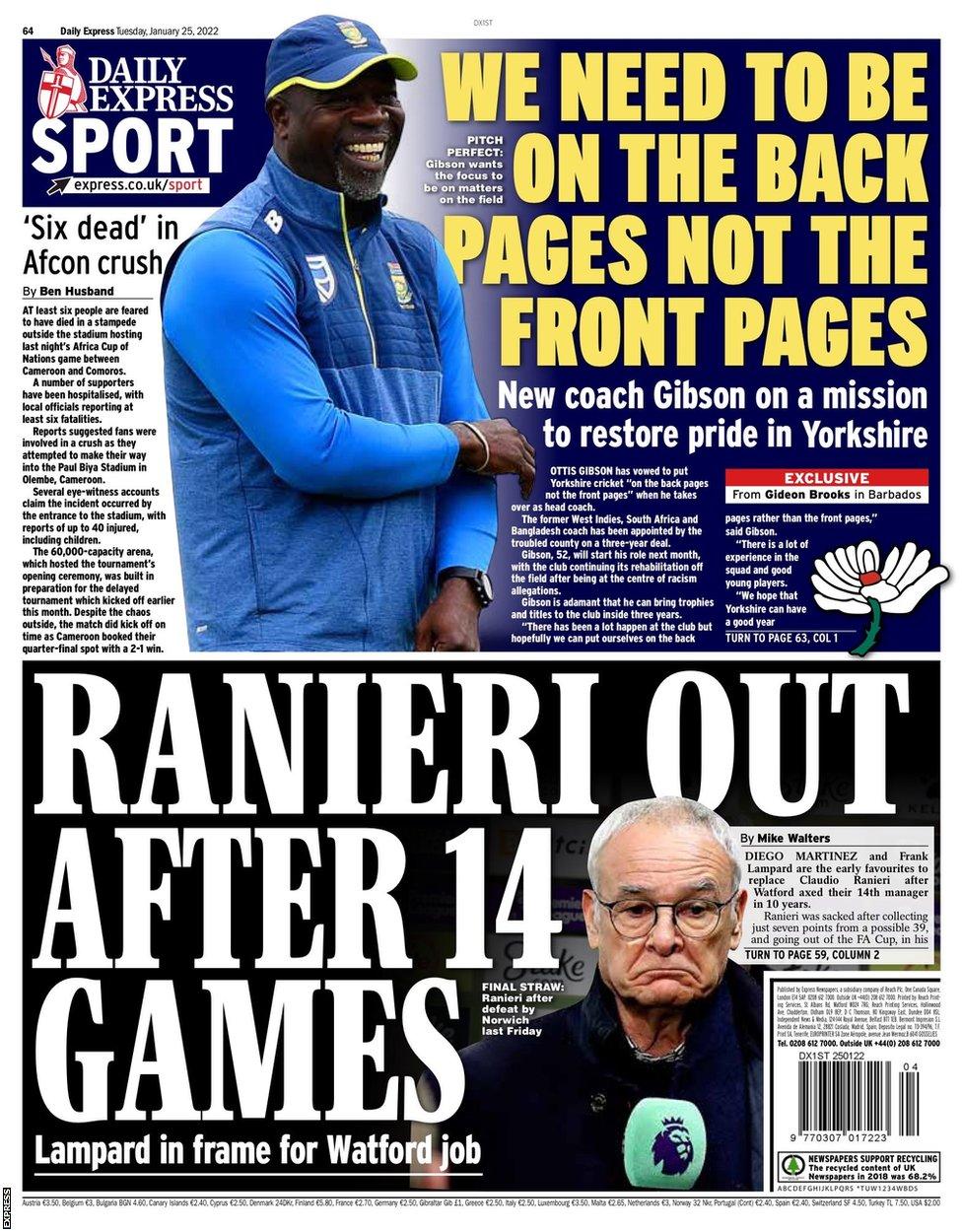 كما عنونت "ديلي إكسبريس": "رانيري في الخارج بعد 14 مباراة.. لامبارد في الصورة لتولي تدريب واتفورد".