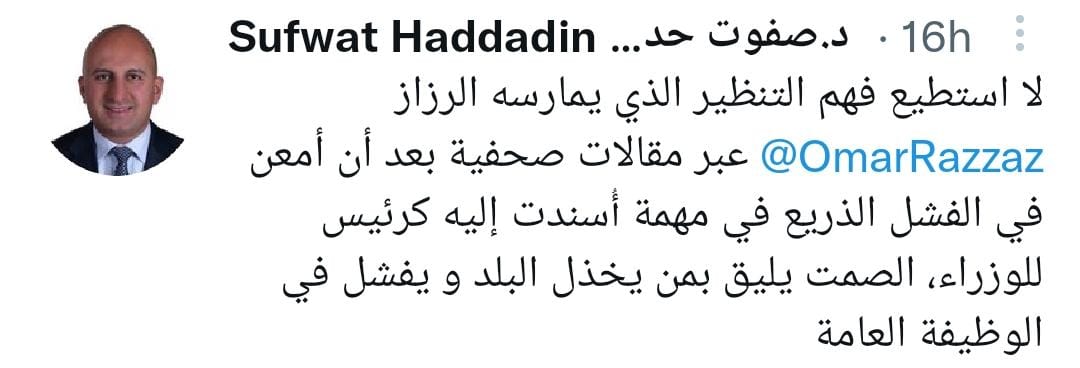 أخبار البلد - خاص - رد الصيدلاني الأردني الدكتور صفوت حداد على مقال رئيس الوزراء السابق الدكتور عمر الرزاز الأخيرة الذي نشره عبر الزميلة الغد، والذي كان بعنوان "التحول الديمقراطي الأردني بين وجهات نظر ووجهات وطن ".