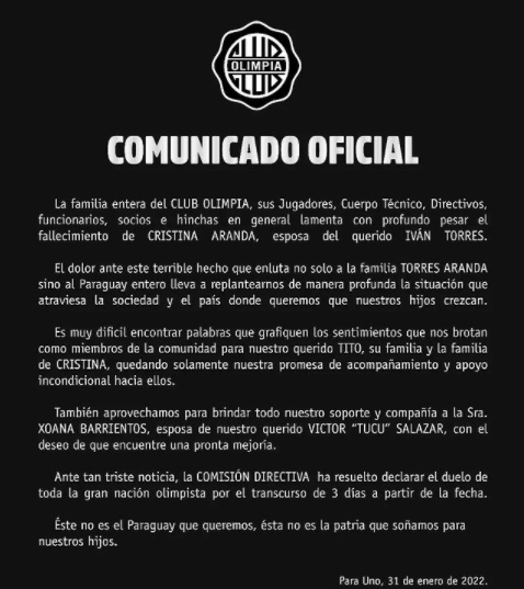 وجاء في بيان النادي: "نعلن الحداد ثلاثةأيامعلى هذه الأخبار المحزنة، هذه ليست باراغواي التي نريدها، هذا ليس الوطن الذي حلمنا به لأطفالنا".