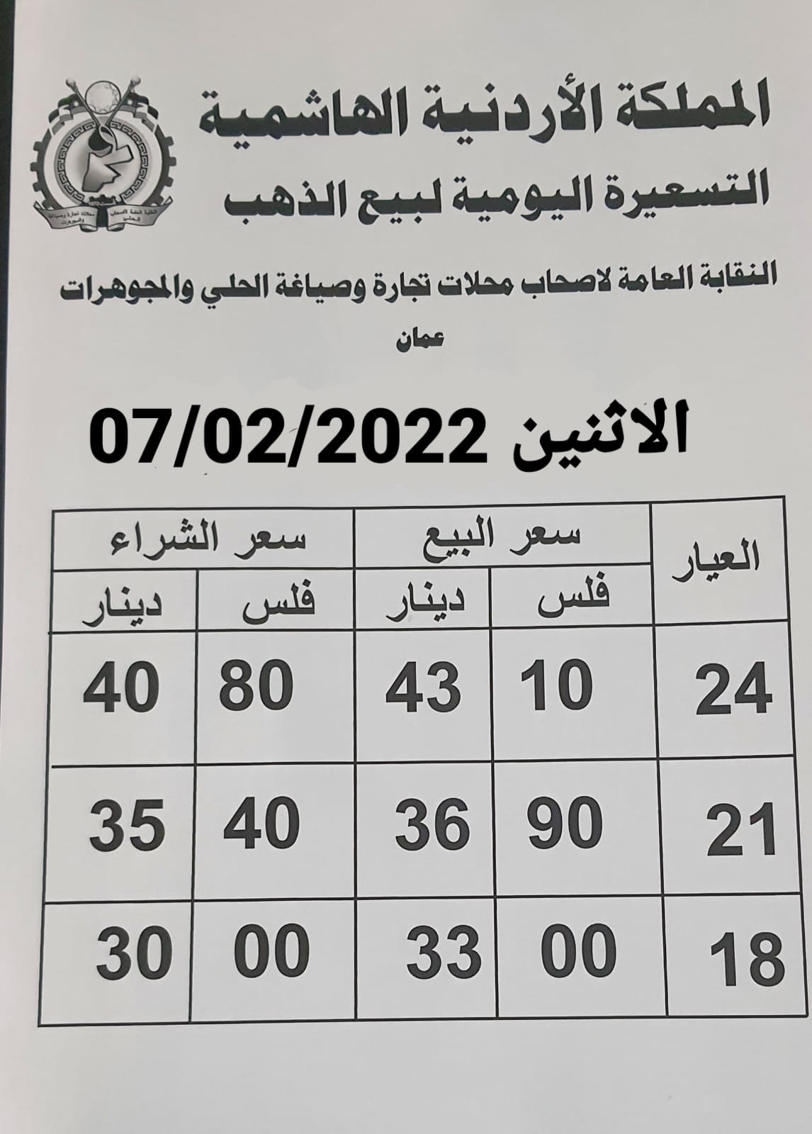 كما بلغ سعر غرام الذهب عياري 24 و18 لغايات الشراء من محلات الصاغة عند 43،10 دينارا، و33 دينارا على التوالي.