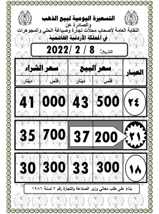 وبلغ سعر غرام الذهب عيار 21 الأكثر طلبا في السوق المحلية 37.20 ديناراً، لغايات شراء المواطنين من محلات الصاغة، مقابل 35.70 دينارا لغايات البيع.