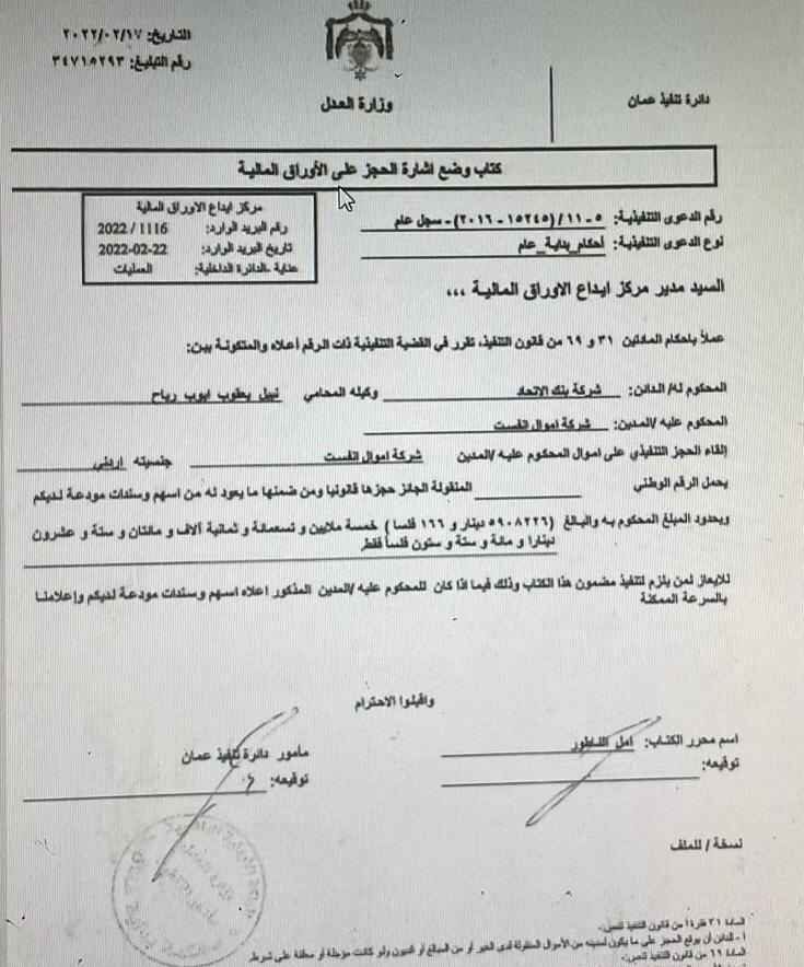 صادر عن دائرة تنفيذ عمان بتاريخ 22 شباط، يقضي بوضع إشارة الحجز التنفيذي على