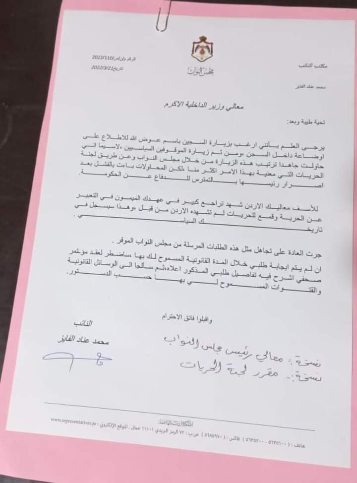 وقال الفايز إنه حاول ترتيب زيارة من خلال مجلس النواب إلا أن المحاولات مع لجنة الحريات في المجلس باءت بالفشل.