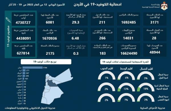 تقرير كورونا الأسبوعي .. 28 وفاة و3171 إصابة جديدة في الأردن