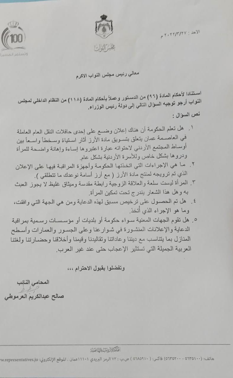 أخبار البلد ــ وجه النائب صالح العرموطي سؤالاً نيابيًا لرئيس الوزراء حول الاجراءات التي اتخذت حول اعلان "ارز اسامة بنوعدك ما تطلقي"، مما اعتبره اهانة للمرأة بشكل خاص ودورها في المجتمع الاردني بشكل عام.