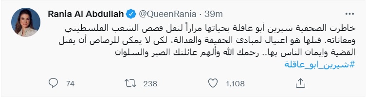 وقالت الملكة في تغريدتها، "خاطرت الصحفية شيرين أبو عاقلة بحياتها مراراً لنقل قصص الشعب الفلسطيني ومعاناته. قتلها هو اغتيال لمبادئ الحقيقة والعدالة، لكن لا يمكن للرصاص أن يقتل القضية وإيمان الناس بها"..