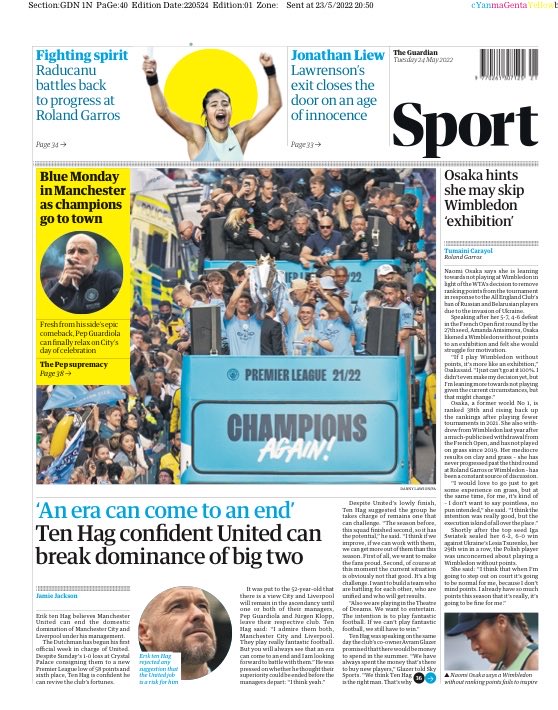 كما قالت "الجارديان": "حقبة تأتي إلى النهاية.. تين هاج واثق من قدرة اليونايتد على كسر هيمنة الثنائي الكبير".