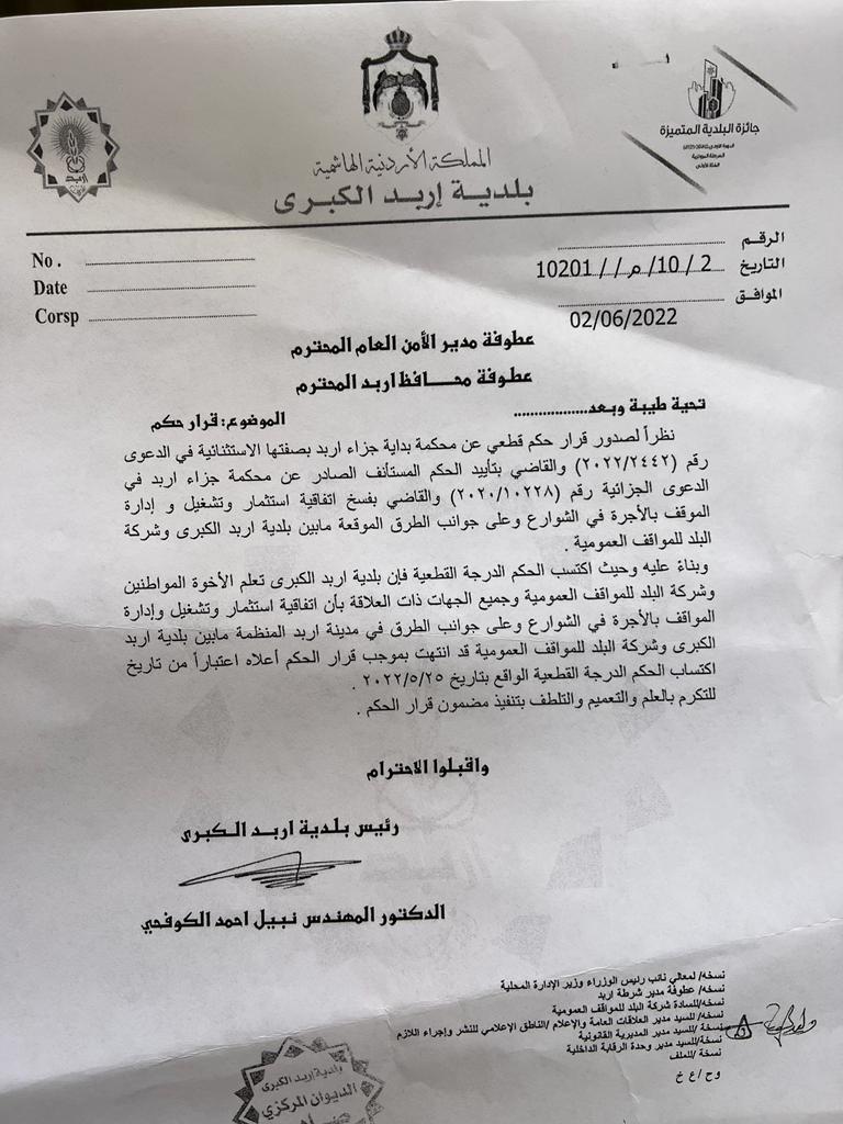 أخبار البلد ــ أصدرت محكمة بداية جزاء اربد بصفتها الاستثنائية قراراً بتأييد الحكم الصادر عن محكمة جزاء ابد والقاضي بفسخ اتفاقية استثمار وتشغيل وإدارة المواقف بالأجرة "الأتوبارك" في الشوارع الرئيسية لمدينة اربد وجوانب الطرق والموقع بين بلدية اربد الكبرى والشركة المعنية، وفق بيان صحفي صادر عن بلدية اربد الكبرى.