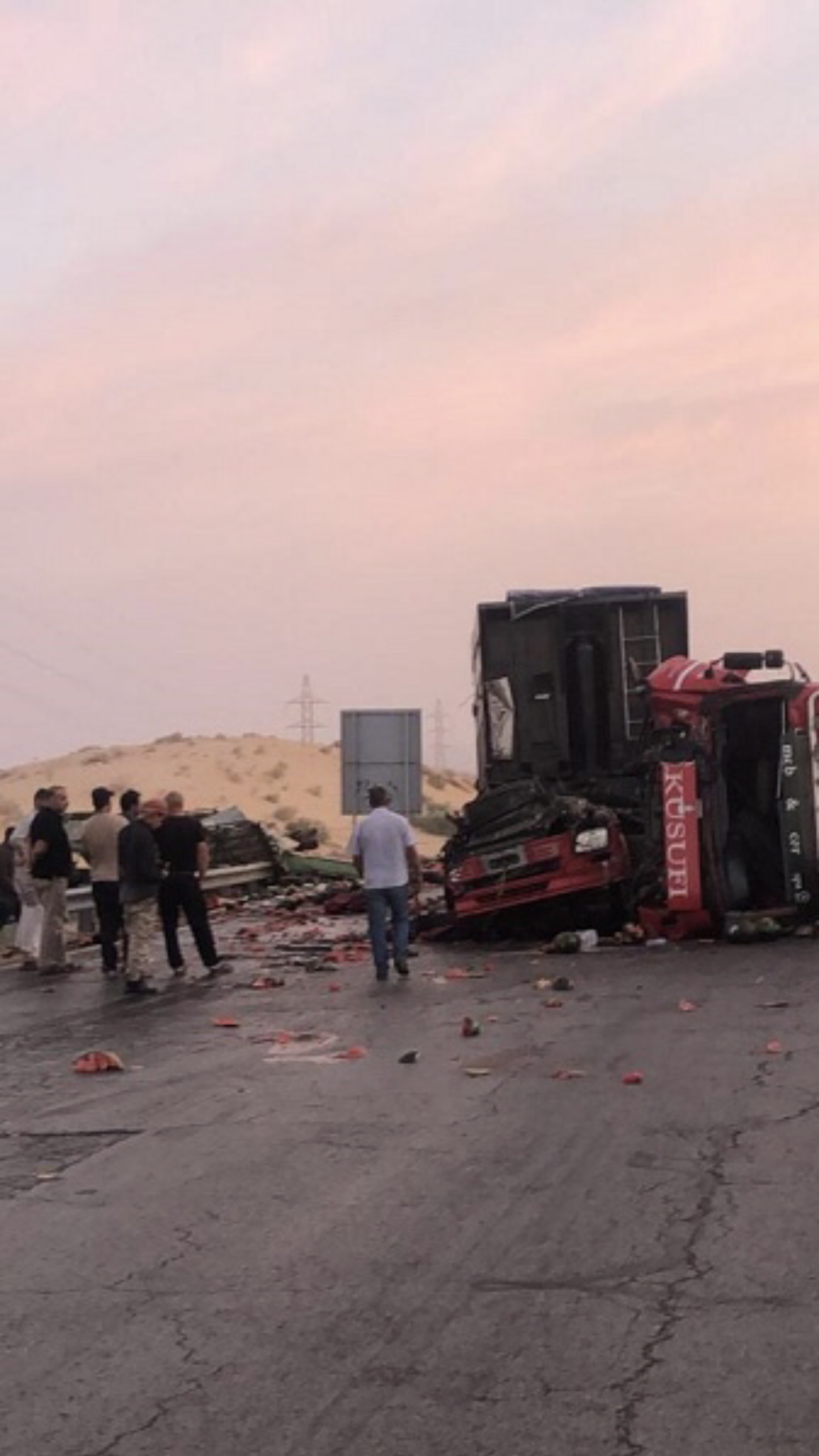 وقال المصدر إن الحادث وقع بين شاحنات عدد 2 "تريلات" مع ديانة محملة بالبطيخ، مشيرا الى انه نتج عن الحادث اصابتين تم نقلهم الى مركز القويرة، وتحويل حركة السير من قبل الدوريات الخارجية.
