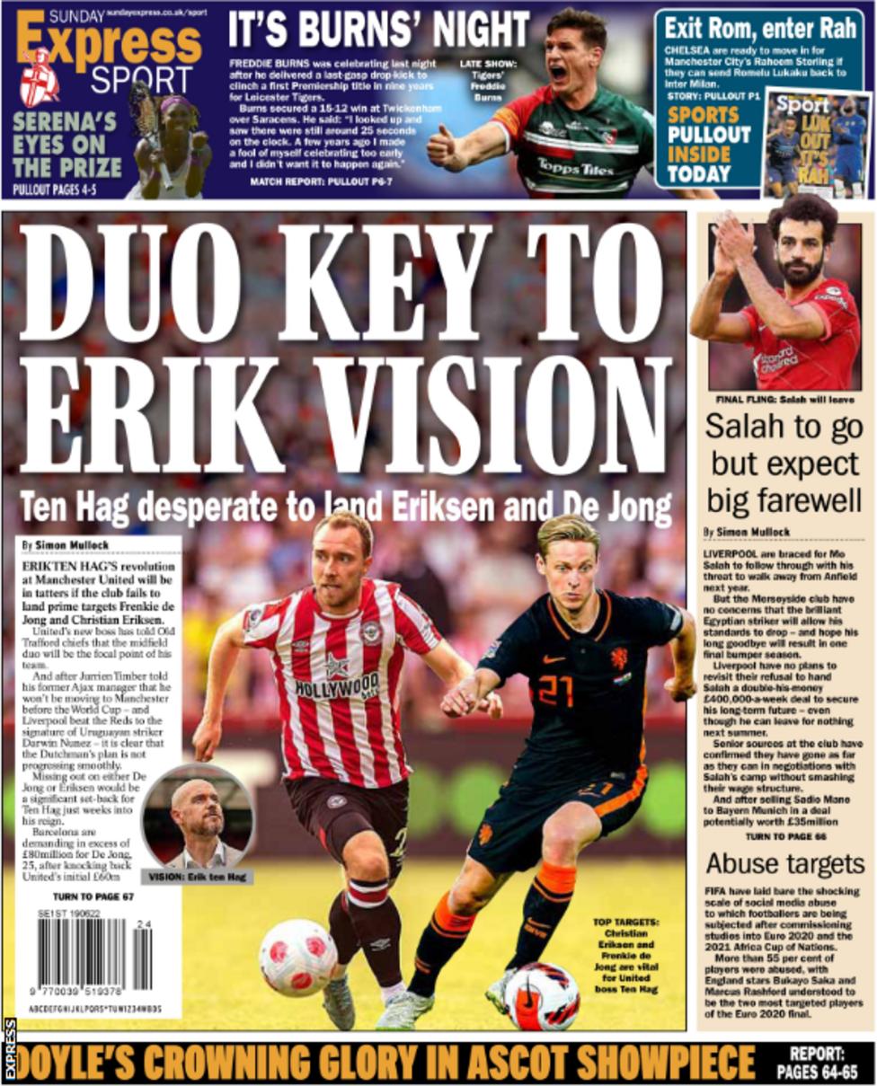 أما صحيفة "ديلي إكسبريس" فعنونت: "الثنائي مفتاح لرؤية إيريك.. تين هاج متحرق لضم إريكسن ودي يونج".