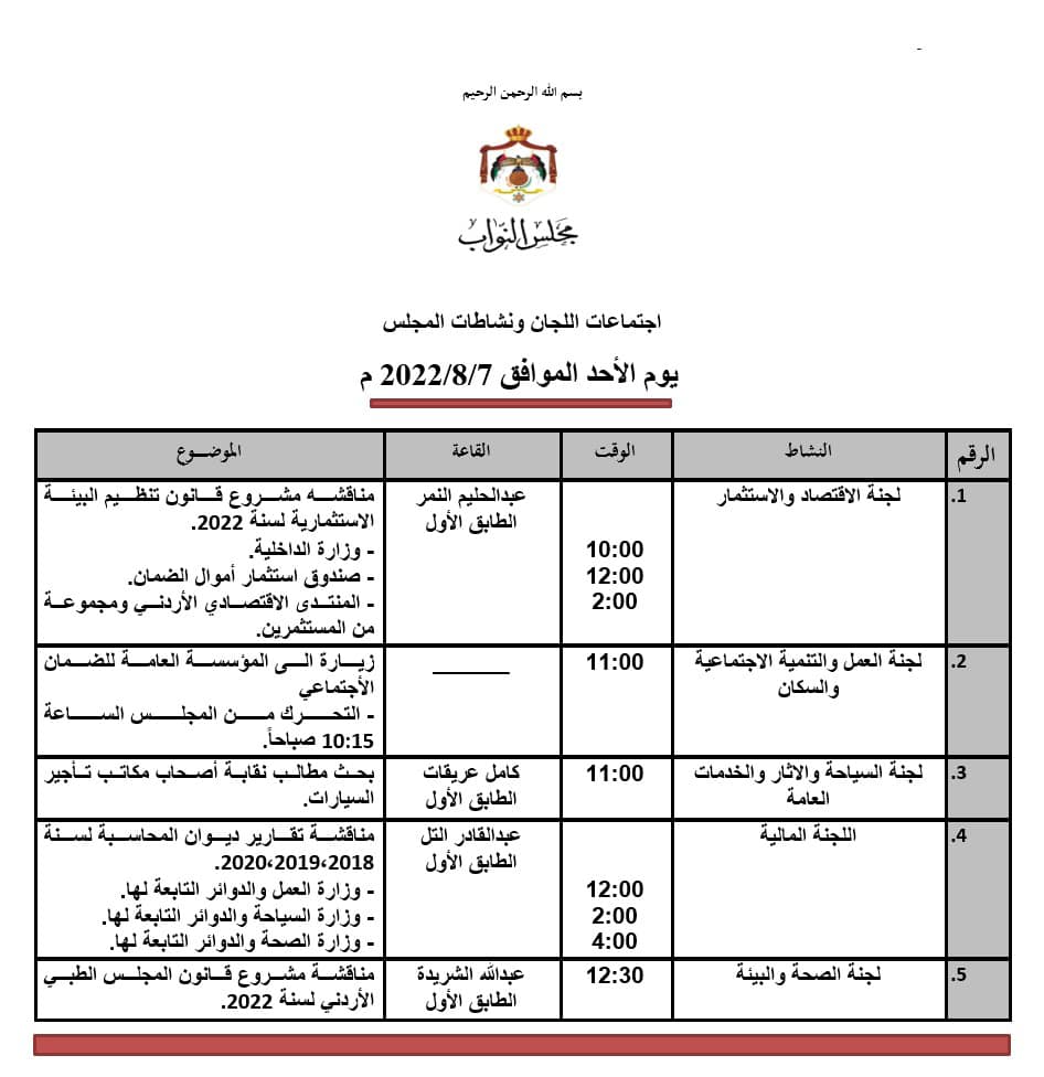 تواصل لجنة الاقتصاد والاستثمار النيابية، مناقشة مشروع قانون تنظيم البيئة الاستثمارية لسنة 2022، مع كل من وزارة الداخلية وصندوق استثمار أموال الضمان الاجتماعي والمنتدى الاقتصادي الأردني ومجموعة من المستثمرين.
