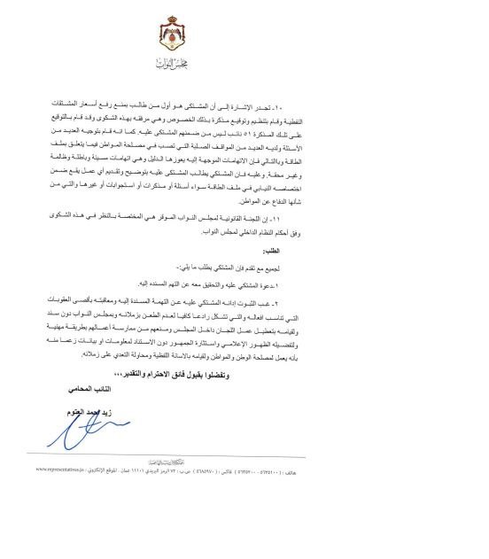 وأكد العتوم تسليم الشكوى للأمانة العامة لمجلس النواب، الثلاثاء، مقدما فيها روايته لما حدث داخل الاجتماع، مطالبا رئيس مجلس النواب دعوة المشتكى عليه النائب القطاونة والتحقيق معه.