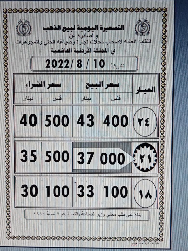 وبلغ سعر شراء غرام الذهب عيار 21 الاكثر رغبة بين المواطنين 37.00 دينارا، فيما بلغ سعر البيع للصاغة 35.50.