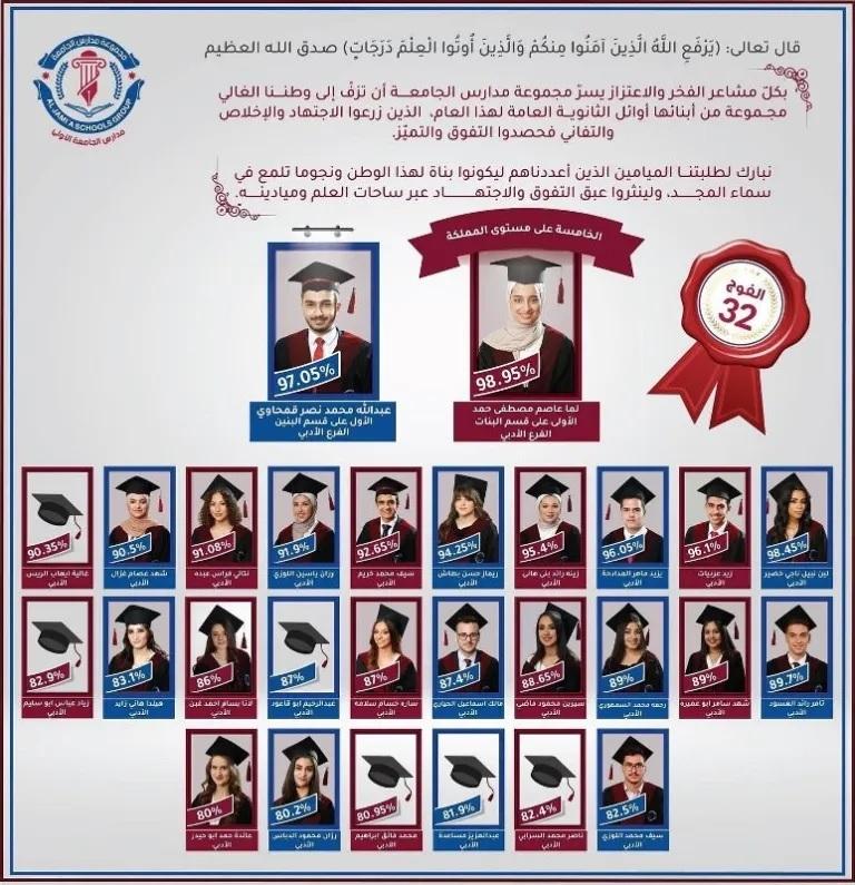 تأكيداً على الدعم المستمر للتفوق العلمي والابداع والتميز وتجسيدا لدور المؤسسات التعليمية الريادي في المسؤولية المجتمعية ، قرر الدكتور ماهر الحوراني رئيس هيئة المديرين لجامعة عمان الأهلية ولمدارس الجامعة تقديم منحة دراسية كاملة بجامعة عمان الأهلية لكافة الطلاب والطالبات المتفوقين في امتحان الثانوية العامة " التوجيهي " 2022 والحاصلين على معدل 80% فما فوق في مدارس الجامعة والبالغ عددهم 26 طالبا وطالبة .