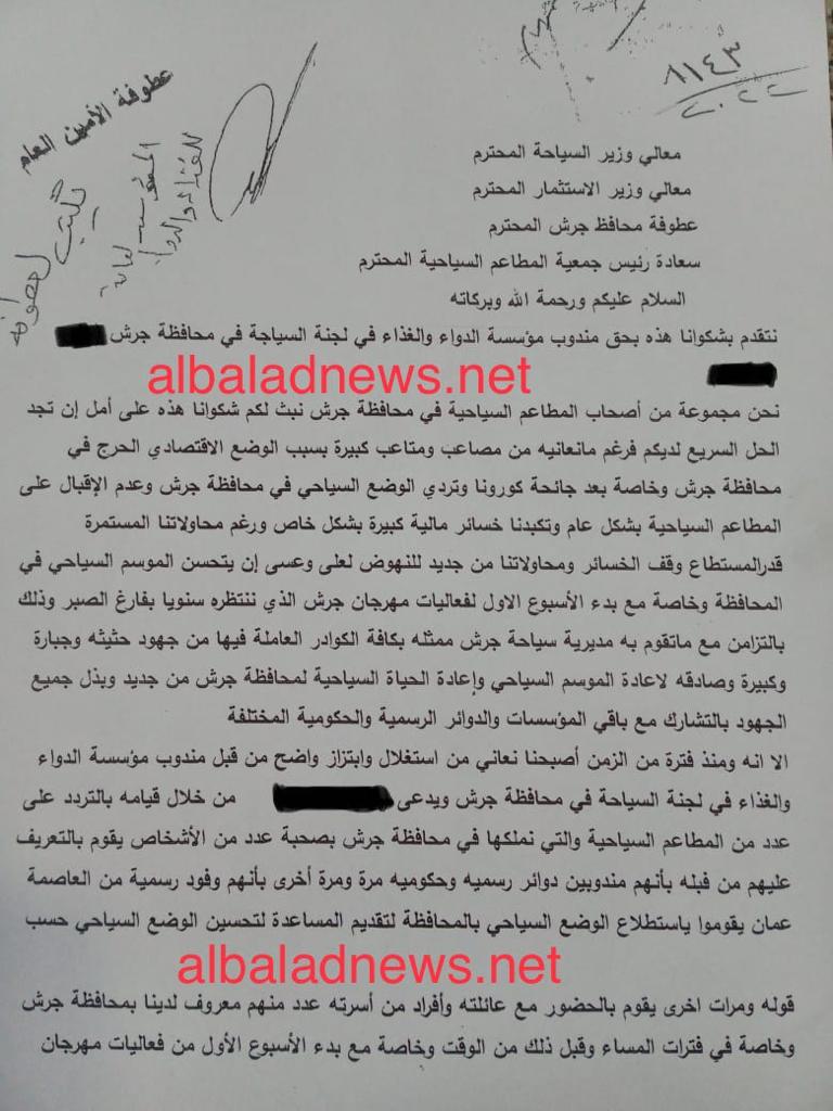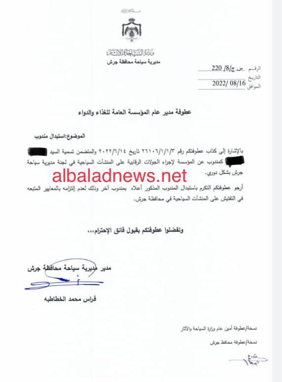 وكان مندوب محافظة جرش قد انتدب بتاريخ 14 حزيران العام الجاري للقيام بمهام التفتيش، لكن نتاج ممارساته الابتزازية والاستغلالية، جعلت مدير مديرية سياحة المحافظة يخاطب مدير عام الغذاء والدواء بتاريخ 16 أب، أي بعد شهرين تقريبًا من اختيار المندوب حسب وثيقة حصلت أخبار البلد على نسخة منها، ليطالب بضرورة استبداله وذلك لعدم اتباعه معايير التفتيش على المنشأت في جرش.