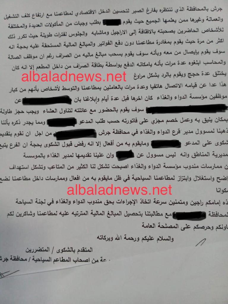 فيما بينت الشكوى أن ائتلافًا من أصحاب المطاعم السياحية رفضوا استمرار مندوب المؤسسة باستغلاهم وابتزازهم وأرادوا تقديم شكوى بحقه إلى مدير فرع المؤسسة في محافظة جرش، لكن الأخير رفض الاستماع لهم بحجه أن الفرع يتبع مديرية المناطق ويجب أن يتوجهوا إلى مقر الغذاء والدواء الرئيسي للإبلاغ عن المندوب.