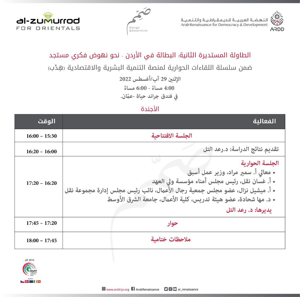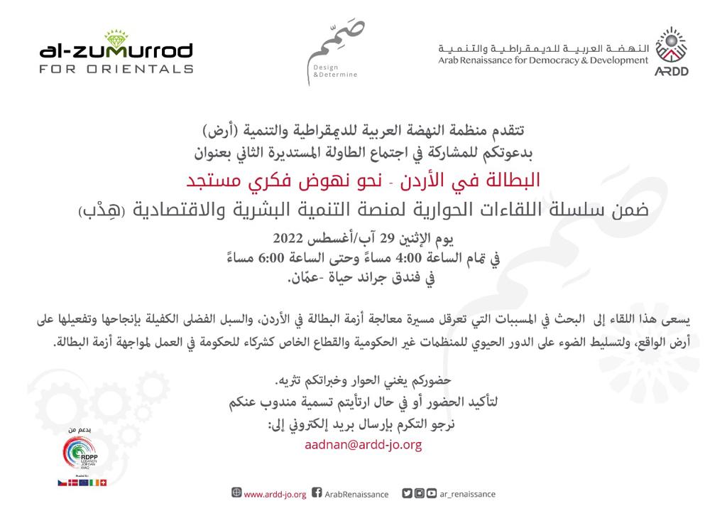 أخبار البلد - أخبار البلد - تنوي منظمة النهضة العربية للديمقراطية والتنمية "أرض" اقامة إجتماع الطاولة المستديرة الثاني بعنون؛ "البطالة في الاردن - نحو نهوض فكري مستجد"، ضمن سلسلة اللقاءاتالحوارية لمنصة التنمية البشرية والاقتصادية "هِدب"، يوم الاثنين القادم في تمام الساعة الرابعة مساءً وحتى السادسة مساءً في فندق جراند حياة عمان.