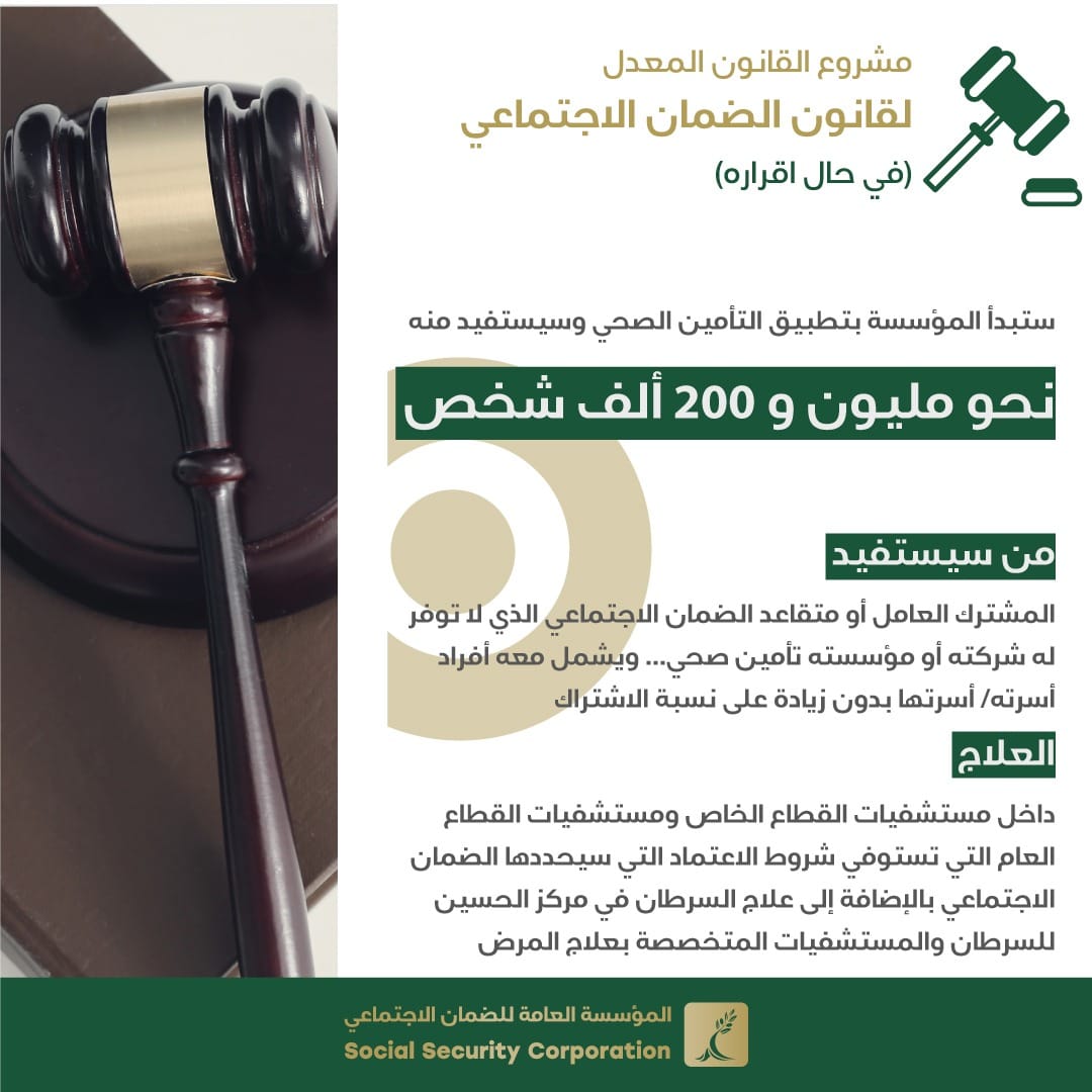 أعلنت المؤسسة العامة للضمان الاجتماعي، أن نحو مليون و200 ألف شخص سيستفيد من التأمين الصحي، حال إقرار مشروع القانون.