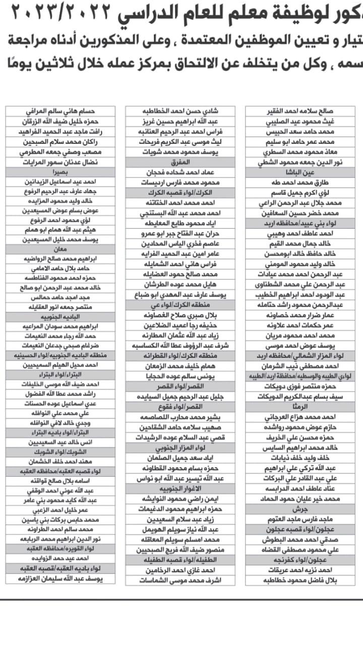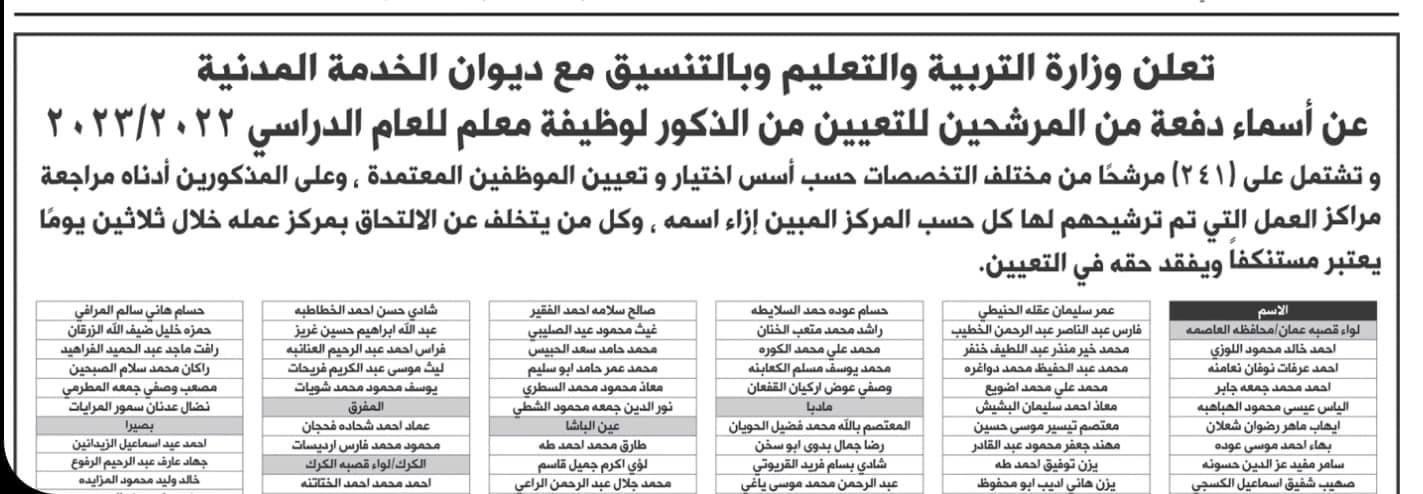أخبار البلد - أخبار البلد - أعلنت وزارة التربية والتعليم وبالتنسيق مع ديوان الخدمة المدنية عن اسماء دفعة من المرشحين من الذكور لوظيفة معلم للعام الدراسي 2022 / 2023.