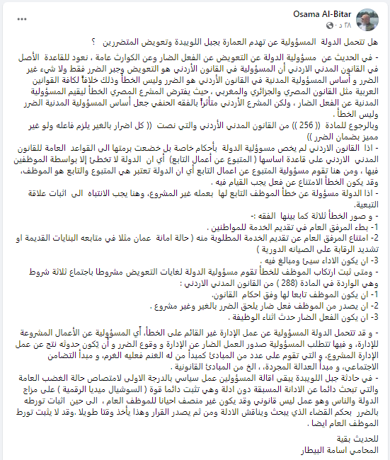 وأضاف البيطار في ادراج له عبر فيسبوك، أن أساس المسؤولية المدنية في القانون الأردني هو الضرر وليس الخطأ وذلك خلافاً لكافة القوانين العربية مثل القانون المصري والجزائري والمغربي، حيث يفترض المشرع المصري الخطأ ليقيم المسؤولية المدنية عن الفعل الضار، ولكن المشرع الأردني متأثراً بالفقه الحنفي جعل أساس المسؤولية المدنية الضرر وليس الخطأ.
