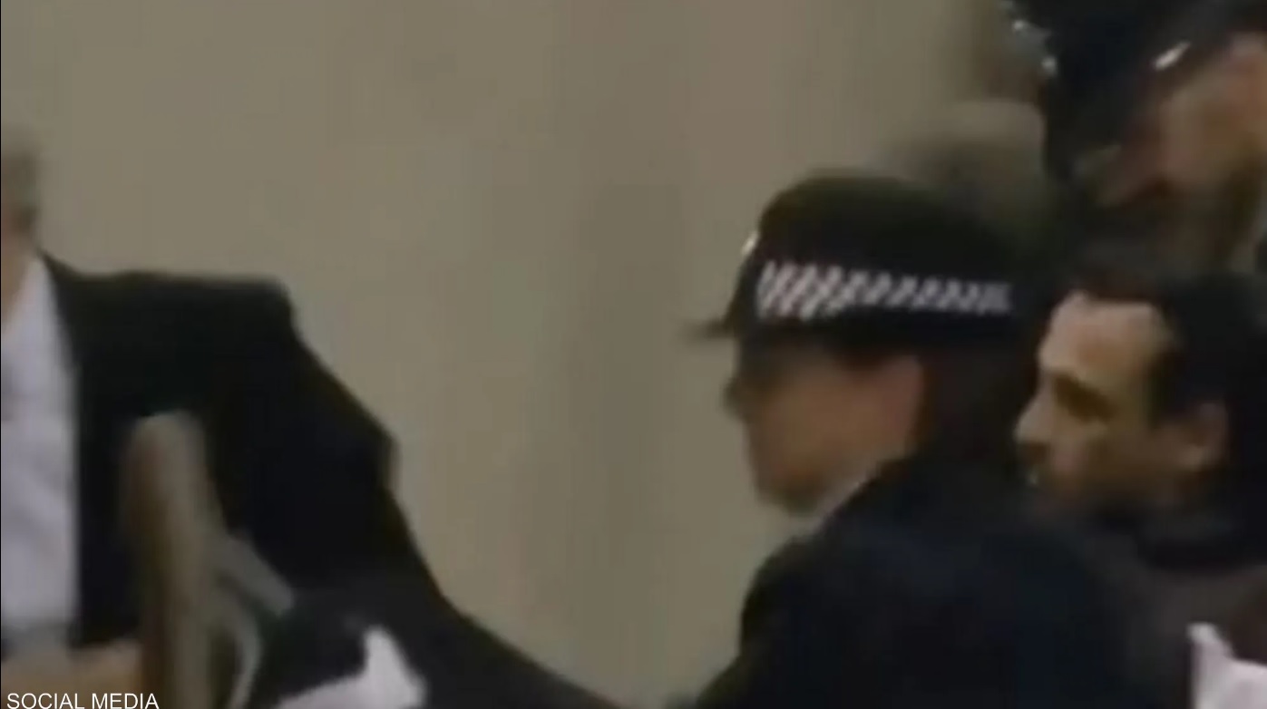 وأظهرت لقطات إمساك عناصر الشرطة البريطانية بالرجل وطرحه أرضا، قبل أن تتم عملية إخراجه من القاعة.