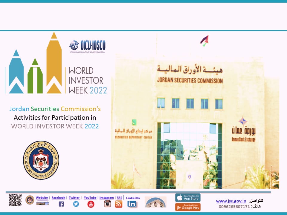 أعلنت هيئة الأوراق المالية مشاركتها في فعاليات أسبوع المستثمر العالمي (World Investor Week) WIW2022، الذي ينطلق في الفترة 3-9 من الشهر الجاري، وتنظمه المنظمة الدولية لهيئات الأوراق المالية IOSCO، بهدف تعزيز الوعي الاستثماري، وتنمية الثقافة الاستثمارية لدى صغار المستثمرين، وحديثي العهد بالاستثمار في السوق المالي بالإضافة إلى العاملين بقطاع الخدمات المالية (كالوسطاء وغيرهم)، ومسؤولي الشركات المساهمة.