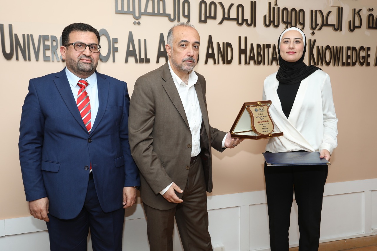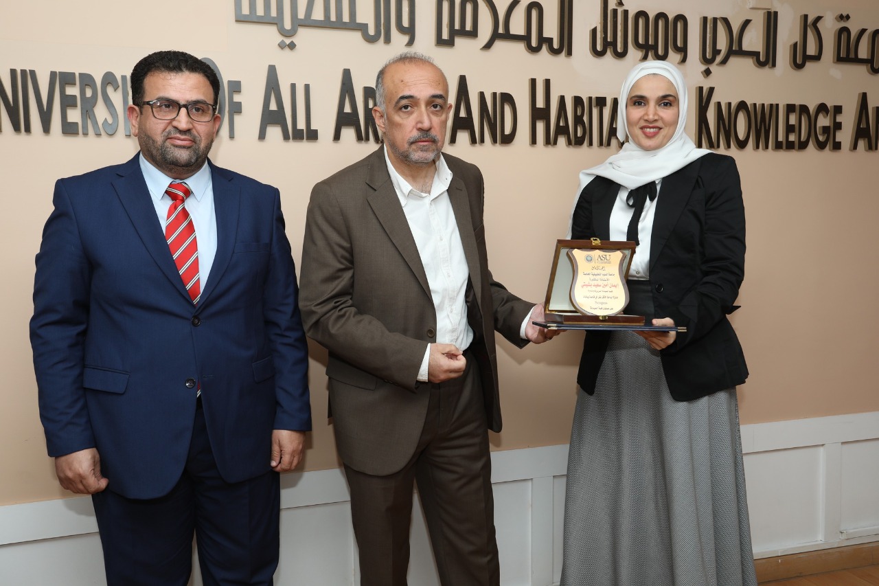 - جائزة الأكثر نشراً في قاعدة بيانات Scopus على مستوى الكليات العلمية: د. رنا كمال خالد أبو فرحة/ قسم الصيدلة السريرية والمداواة/ كلية الصيدلة.