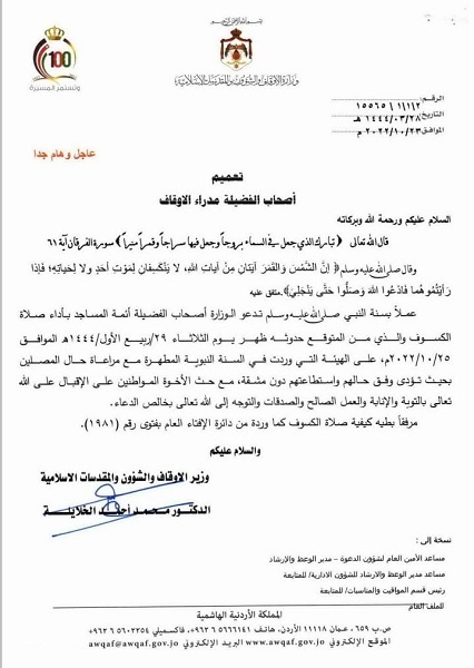 أخبار البلد - دعت وزارة الأوقاف والشؤون والمقدسات الإسلامية أئمة المساجد بأداء صلاة الكسوف وذلك عملًا بسنة النبي - صلّى الله عليه وسلم - في ذلك اليوم على الهيئة التي وردت في السنة النبوية.