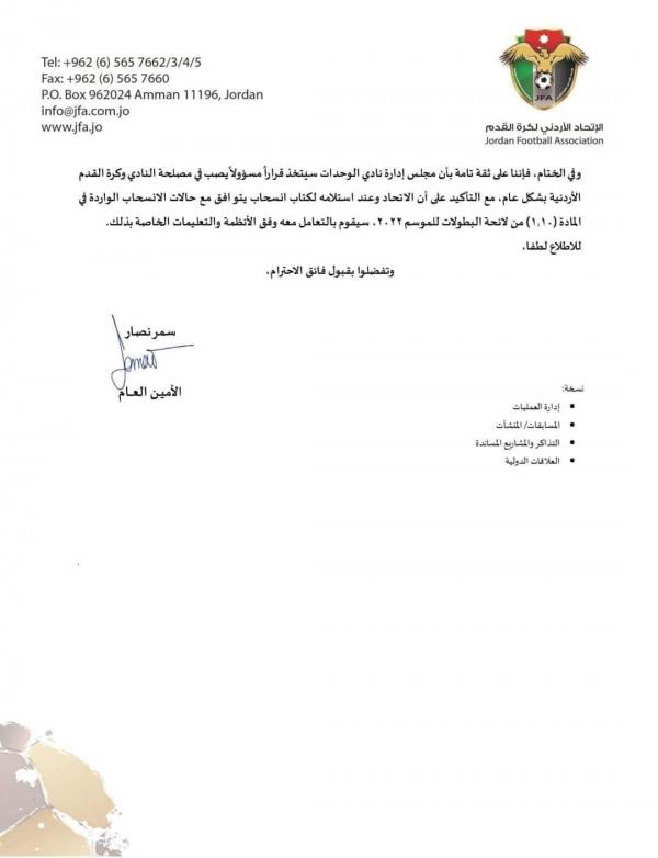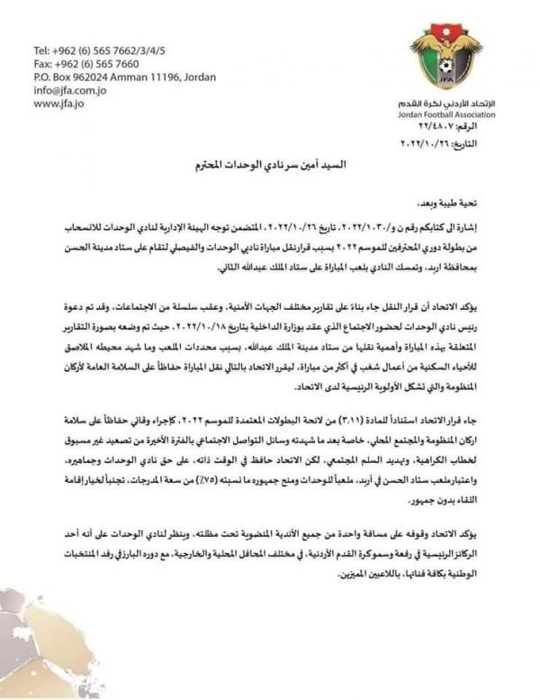 أخبار البلد - رد الاتحاد الأردني لكرة القدم على الكتاب الوارد من نادي الوحدات بشأن انسحابه من منافسات الدوري الأردني للمحترفين، بعد نقل مباراة الديربي إلى محافظة إربد بدلا من القويسمة.