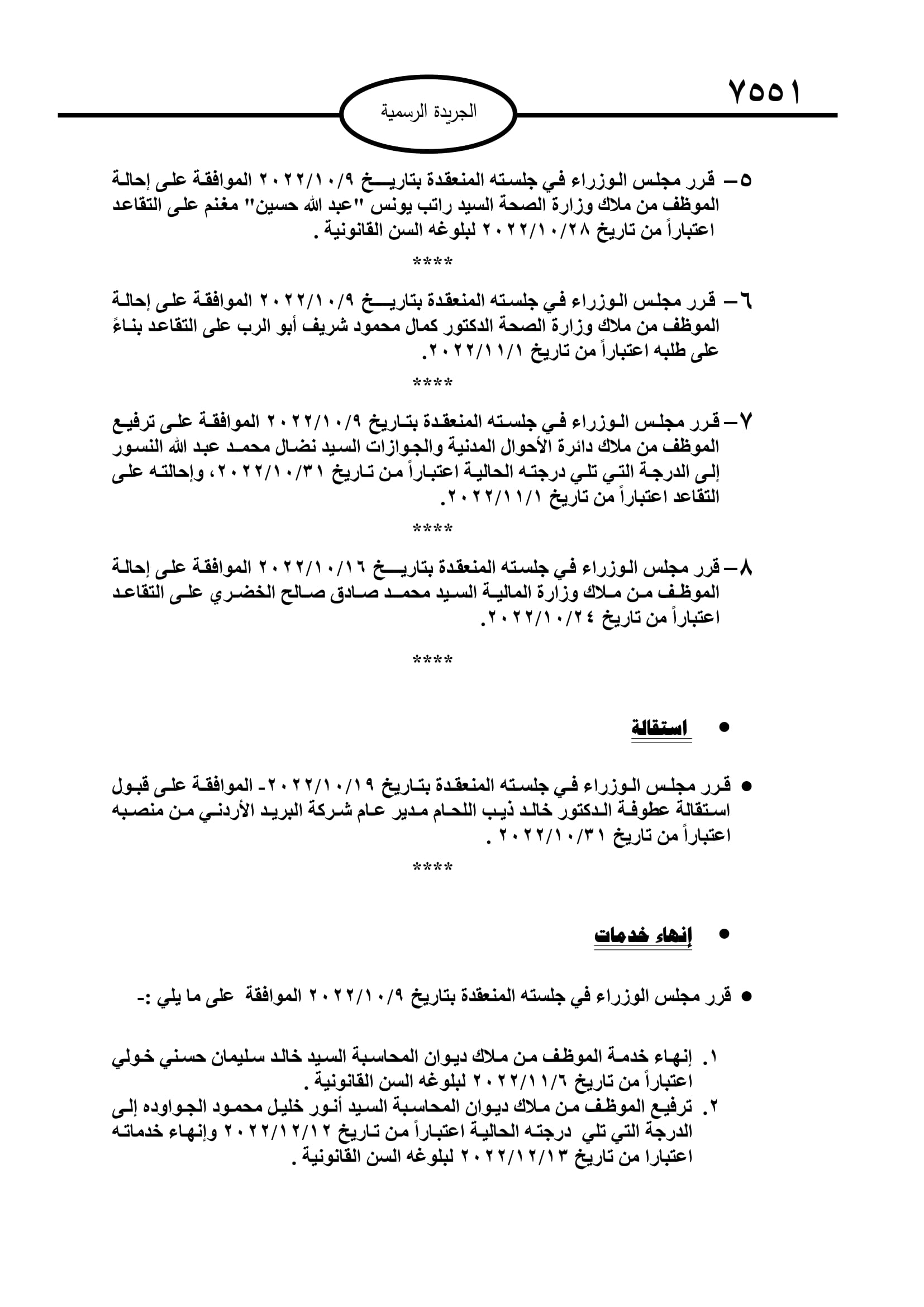 أخبار البلد ــ صدر في عدد الجريدة الرسمية اليوم الثلاثاء قرارت مجلس الوزراء باحالة عدد من موظفي الدولة الى التقاعد، وانهاء خدمات آخرين.