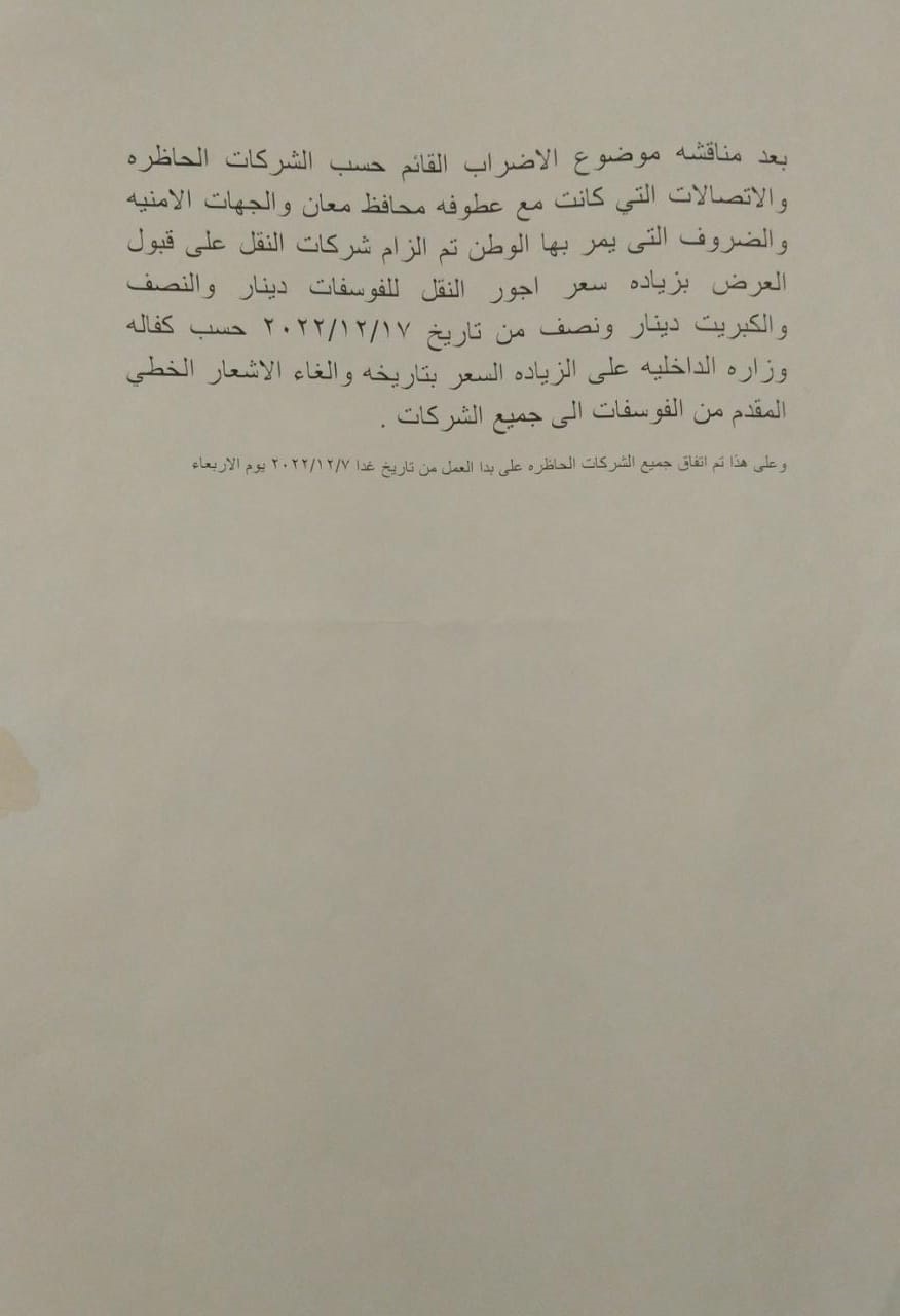 وبناءًا على الاتفاق الذي تم التوصل إليه ، تم إنهاء الإضراب في جميع محافظات المملكة، وإلزام شركات النقل على قبول زيادة الأجر اعتبارًا من تاريخ 17 من الشهر الجاري وبحسب كفالة وزارة الداخلية على الزيادة وإلغاء الاشعار الخطي المقدم من الفوسفات إلى جميع الشركات.